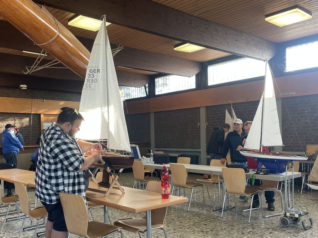 Začalo to o týden dříve ne tak ranním brzkým odjezdem na Těrlicko, nyní tedy byl odjezd už v půl druhé v noci. Jelikož se Martina s Tomášem v pátek odpoledne ještě vydali na houby a hodně našli, tak jsem po sedmé hodině šel spát jen já a oni dva si z kuchyně od krájení a smažení hub přesedli rovnou do auta. Cesta byla bez problémů, jen Tomáš budil Martinu u hraniční německé policejní kontroly na D8, v Německu nesmí na předních sedadlech spát ani spolujezdec. Pak už opět usnuli oba, Tomáš na celou cestu, Martina se na dvou krátkých zastávkách vzbudila. Před osmou hodinou jsme byli na místě, chvíli před Borkem. Vyložili jsme plachetnice do velké místnosti klubového areálu rychlostních vodáků, postaveném v sedmdesátých letech na ostrově rekultivovaného rekreačního areálu, původně to byla štěrkovna, více viz starší článek Jirky Kreisla z roku 2009. Oficiální zahájení bylo plánováno až na 10:30, takže dost času na příjezd dalších účastníků s asi 30 modely plachetnic z blízkého i vzdálené okolí – až po Drážďany nebo Sársko na jihozápadě. Při zahájení byl každý nový, a i delší dobu vynechávající účastník, představen (byli jsme asi čtyři) a pak nám separátně byl vysvětlen systém závodění, počítání jízd a přivolání záchranného člunu (při nejhorším i mobilním telefonem). Oproti rozpisu v propozicích se již několik let jezdí jen společná regata všech účastníků okolo ostrova. Vzhledem k počítání prostého součtu odjetých časů, případně násobených koeficientem modelu, nelze zařadit do výsledků model s vynechanou, nedojetou jízdou.