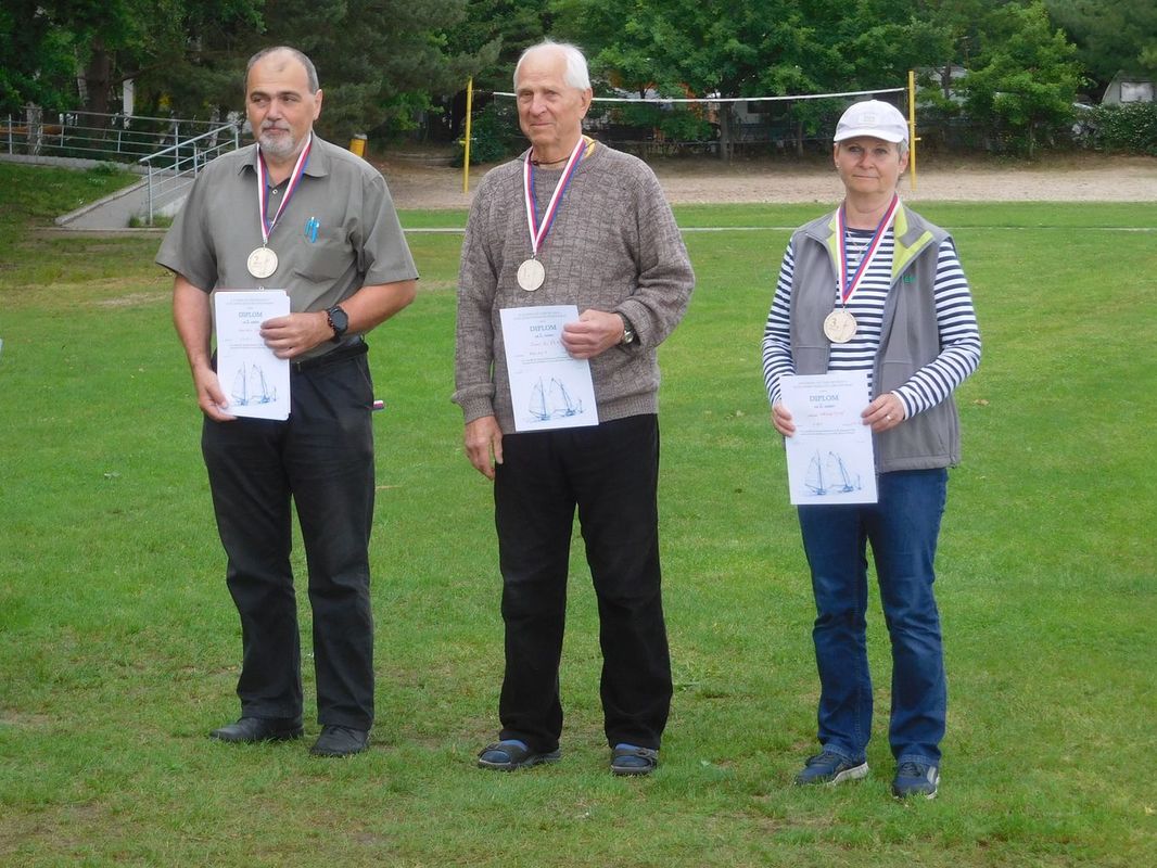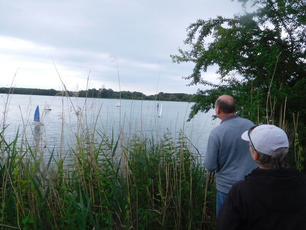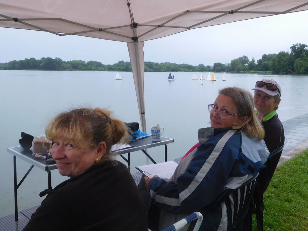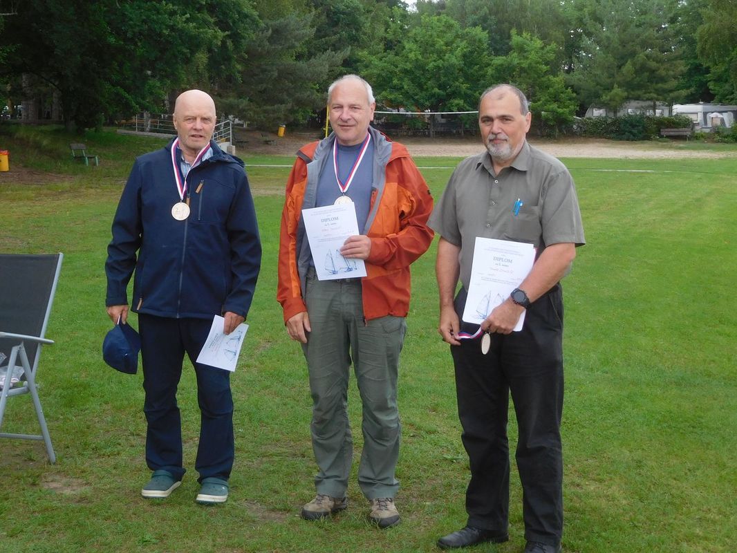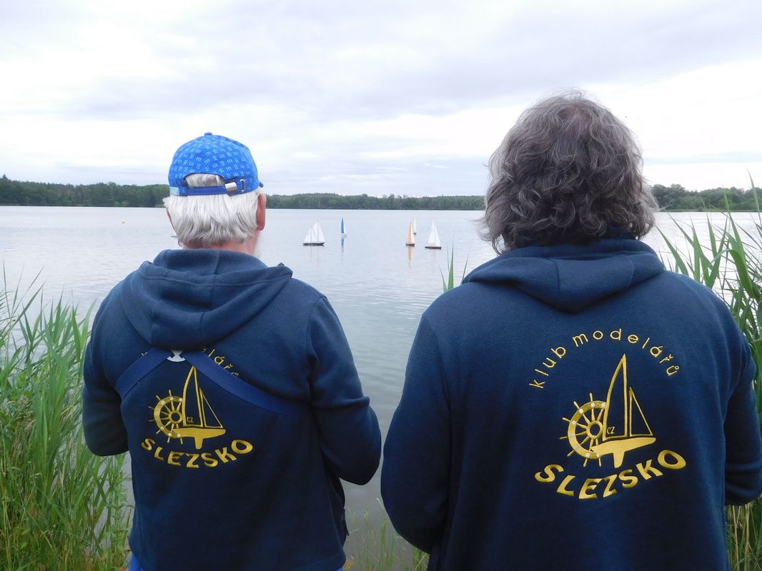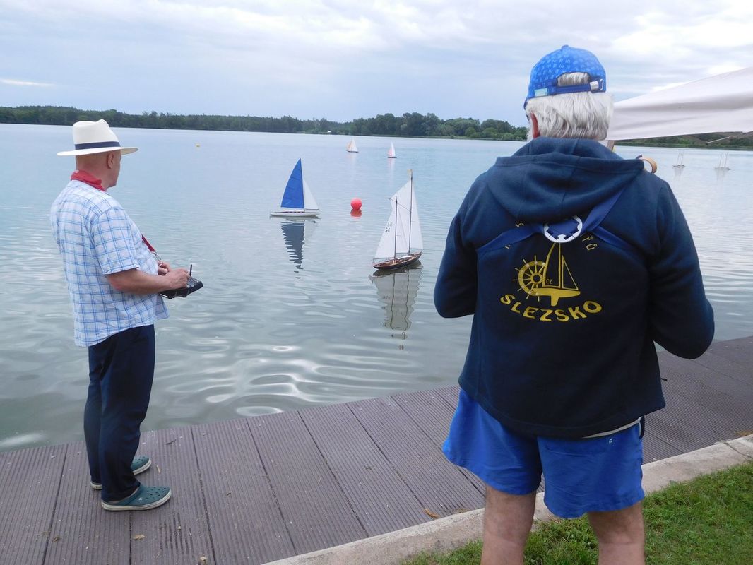 Ti se hned i zapojili do pomoci u rozhodcovského stolku. V jednu chvíli tam však seděly naše čtyři rozhodčí a rozebíraly chování a dovednosti svých malých vnoučat, v rohu stanu je musel znuděně poslouchat Tomáš jako vedoucí startoviště (asi nová generace na naše důchody hned tak nebude). Oproti pátku se vítr odpoledne začal stáčet na jižní, byť slabý, pro nás přeci jen čitelnější, přicházející přes volnou plochu rybníka. Před pátou jsme měli hlavní program splněn a zbývalo dojet jen dvě páteční jízdy juniorů. Večer pod stanem pak bylo tradiční grilování zejména ze slezských zásob a od spřízněnců slezského klubu. Jedno z hlavních témat debaty pod stanem byly výhody zachování dvou samostatných domácností postarších párů.