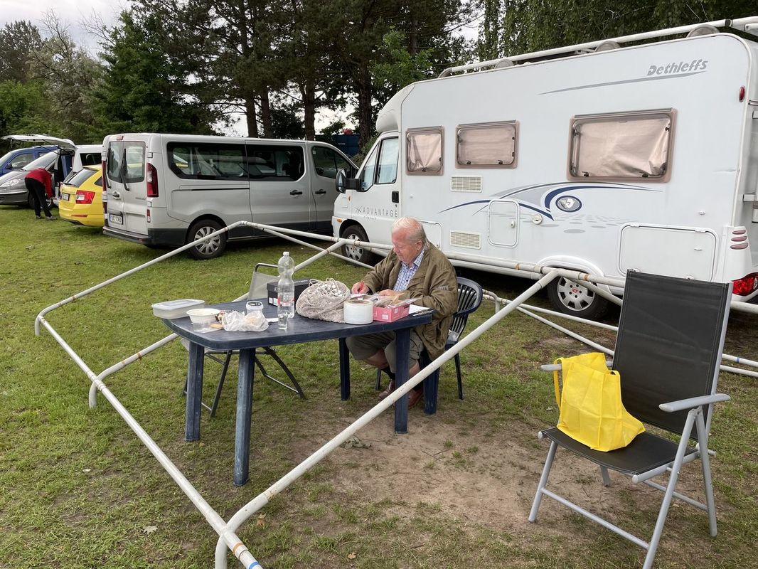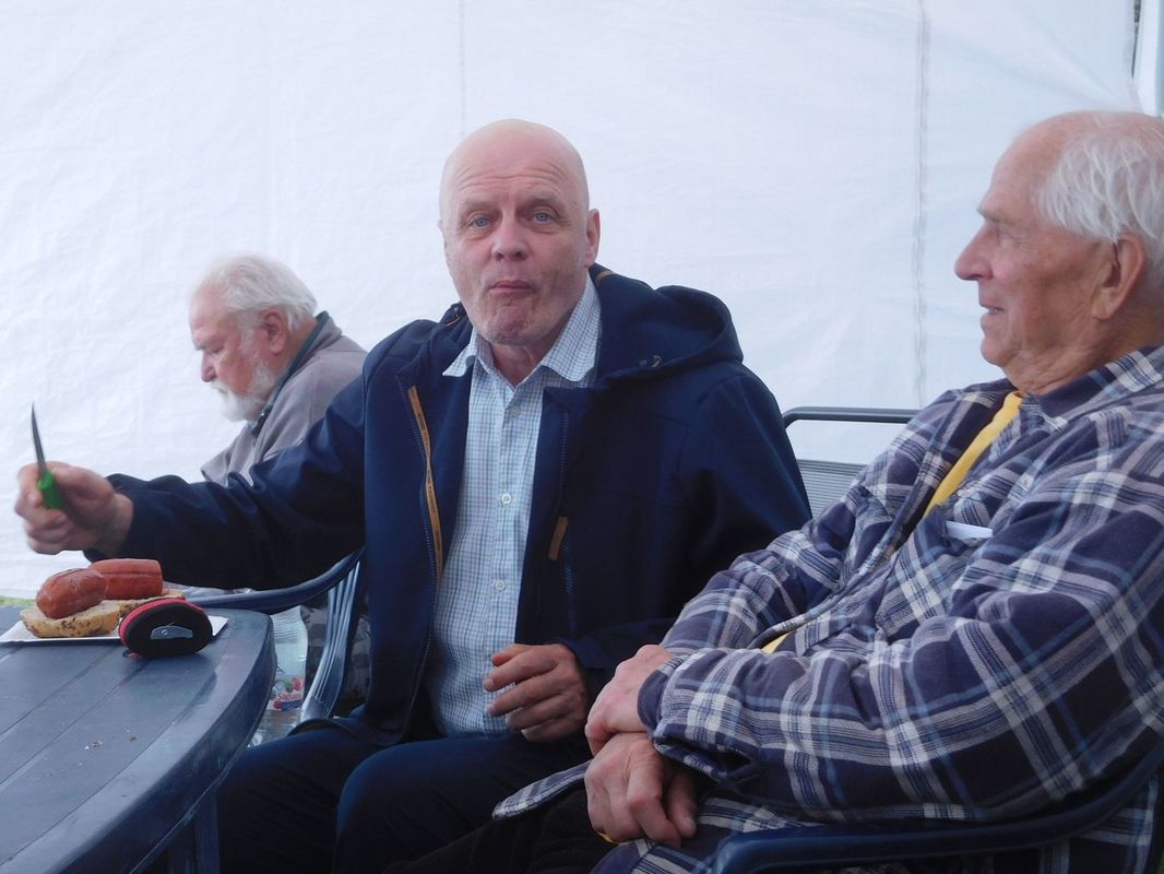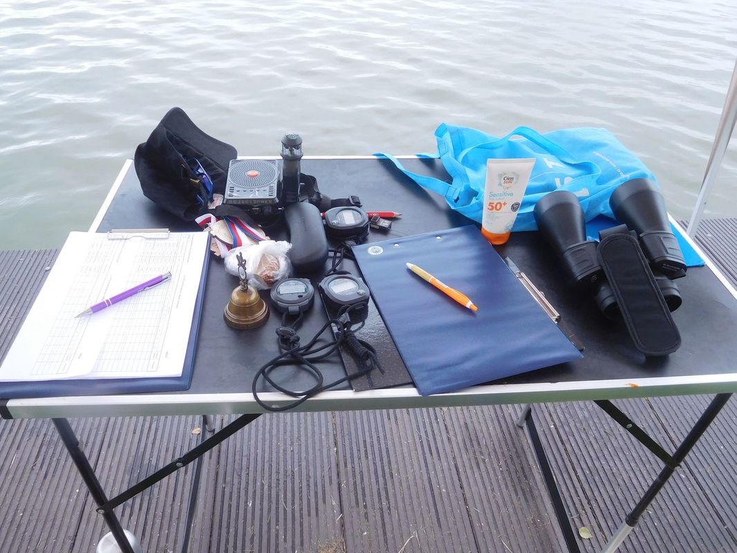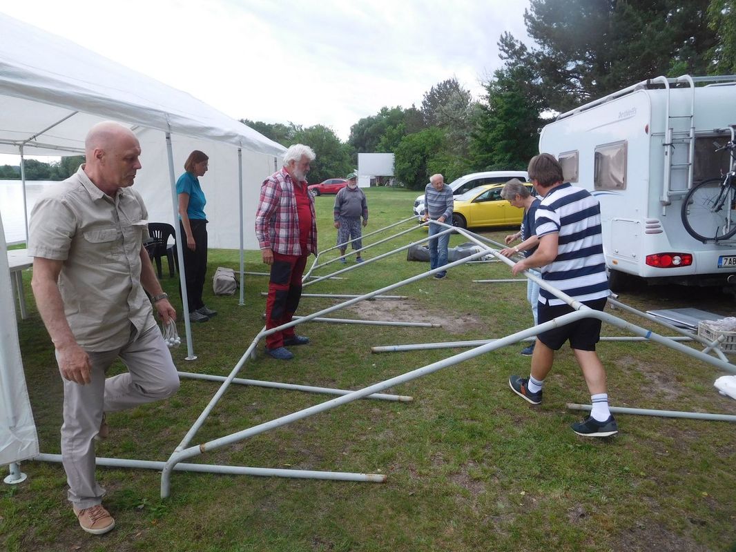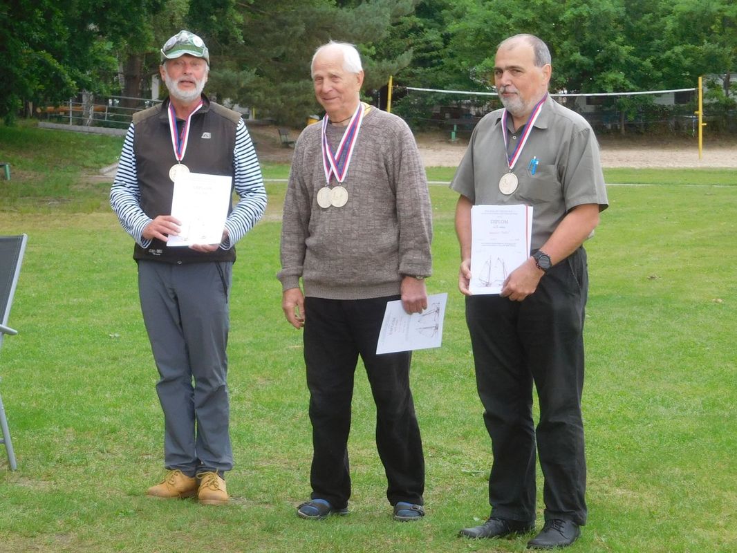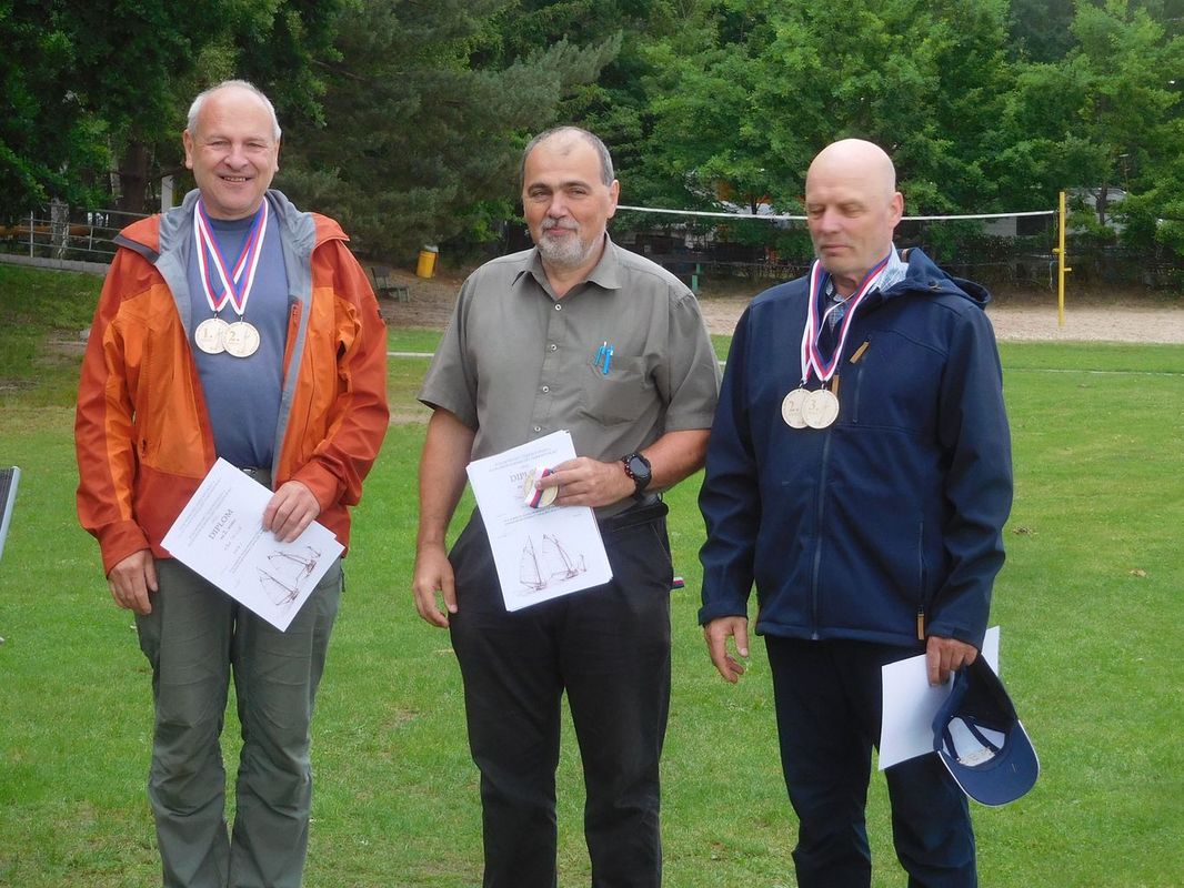 Ti se hned i zapojili do pomoci u rozhodcovského stolku. V jednu chvíli tam však seděly naše čtyři rozhodčí a rozebíraly chování a dovednosti svých malých vnoučat, v rohu stanu je musel znuděně poslouchat Tomáš jako vedoucí startoviště (asi nová generace na naše důchody hned tak nebude). Oproti pátku se vítr odpoledne začal stáčet na jižní, byť slabý, pro nás přeci jen čitelnější, přicházející přes volnou plochu rybníka. Před pátou jsme měli hlavní program splněn a zbývalo dojet jen dvě páteční jízdy juniorů. Večer pod stanem pak bylo tradiční grilování zejména ze slezských zásob a od spřízněnců slezského klubu. Jedno z hlavních témat debaty pod stanem byly výhody zachování dvou samostatných domácností postarších párů.