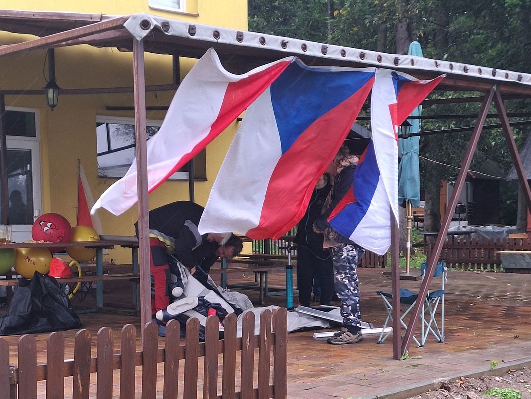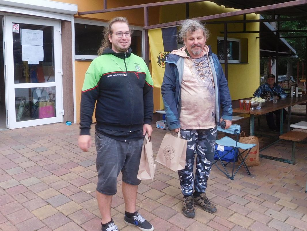 Vylezu z auta a jdu se pozdravit s pořadateli. René a Sebastián Walentovi společně s Val už pilně nosí spousty věcí z auta do hospody Na Vyhlídce, kde je zázemí. Renek mě zde provádí. Ukazuje mi, kde jsou záchody, výčep, lednička, kuchyně... Potkávám i Frantu Chmelku, Pavla Strenka a pro mě novou tvář Jardu Sýkoru. Po chvíli přijíždí i Zdenda Kopecký. S jeho odbornou asistencí narážíme sud a dostáváme školení jak správně načepovat pivo. (Na čepu je Radegast 10). Asi v 16.00 se déšť mění v mrholení, a tak jdu pomoci Zdendovi postavit stan k jeho autu. Během stavby stanu si to počasí rozmyslí a déšť opět sílí. Vracím se do hospody poněkud navlhlý. Ale nemám si nač stěžovat. Pořadatelé ještě musí postavit trať…