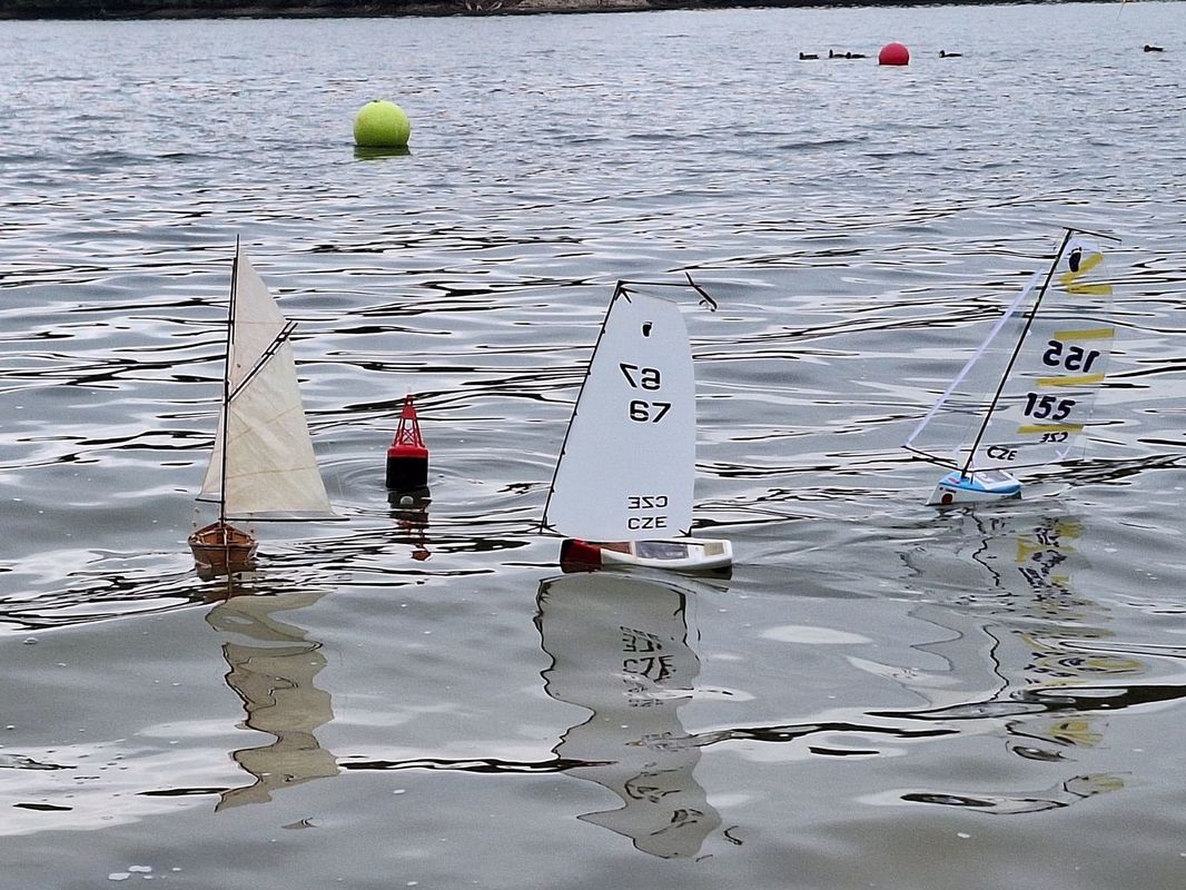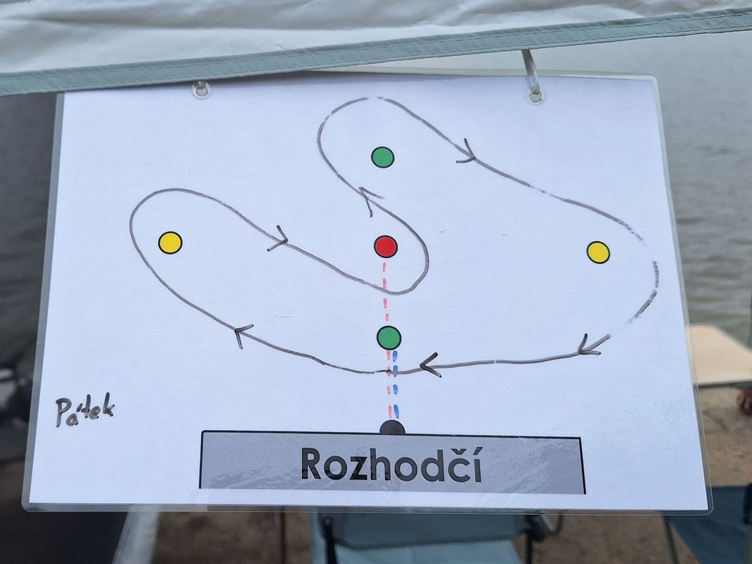 V 10 hodin začal závod o tradiční Těrlickou buchtu. První rozjížďka. Bylo pod mrakem, ale už nepršelo jako předešlého dne. Větrné podmínky ideální. Vítr mírný, stálý. Trasa neobvyklá. Místo klasického trojúhelníku vedoucí startoviště rozhodl o trati ve tvaru prokopnutého míče... Nevím, jak to dobře popsat. Koukněte se na obrázek. Společně s plachetnicemi NSS jely i RGčka.