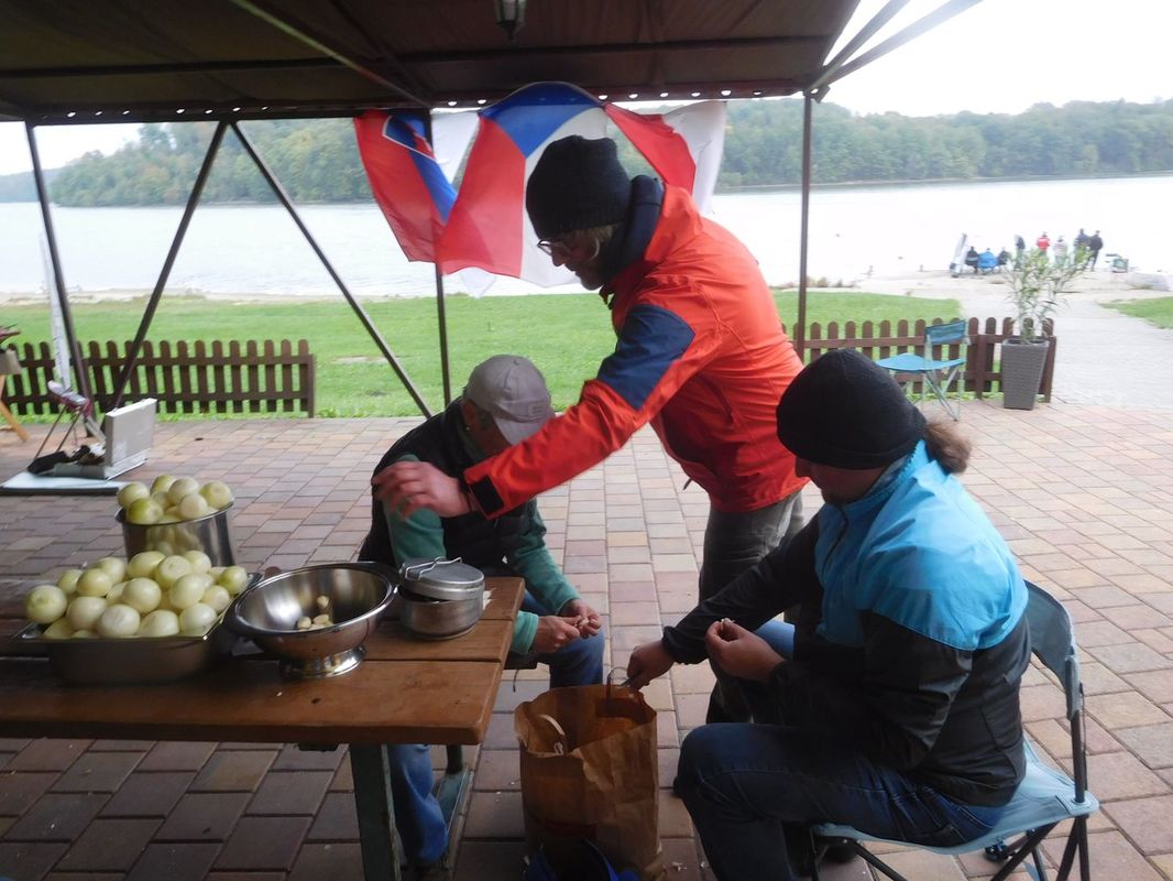 Asi v 16 hodin vypukl závod Footyn. Ty měly vlastní zmenšenou trať a vlastní roztomilé maketové bójky. I když si jedna zelená bójka chvílemi hrála na ponorku a postupně se ponořovala. Někdy v této době jsem ronil slzy při loupání cibule na zítřejší guláš. Společně s Pavlem Strenkem a Peterem Kozákem jsme jí oloupali asi 10 kg. Později jsme oloupali ještě česnek i s pomocí Lenky Mrákotové. Zbytek už byl na kuchaři, který měl teprve dorazit.