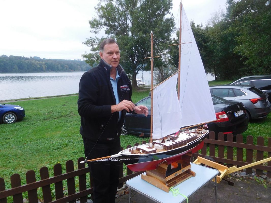 Jarda Sýkora vyzkoušel svůj kutr Aldebaran na vodě. Byl jsem zvědav, jak si povede s příčným oplachtěním, ale moc jsem toho neviděl. Plul pouze na podélné oplachtění. Příčné plachty předvedl pouze na břehu. I tak to bylo pro mě velmi inspirující a pořídil jsem spoustu „špionážních“ fotek. Když pak začal loď odstrojovat, nechal se ještě vyhecovat, a předvedl nám postupnou salvu z funkčních děl. Klobouk dolů. Práskalo mu to pěkně. Zbytek setkání závodil s RGčkem. Byl jsem vcelku překvapen jak rychlé ty RGčka vlastně jsou. Jejich slabinou jsou ovšem čeleny jiných větších lodí. Kolem 18.00 bylo vyhlášení výsledků závodů.