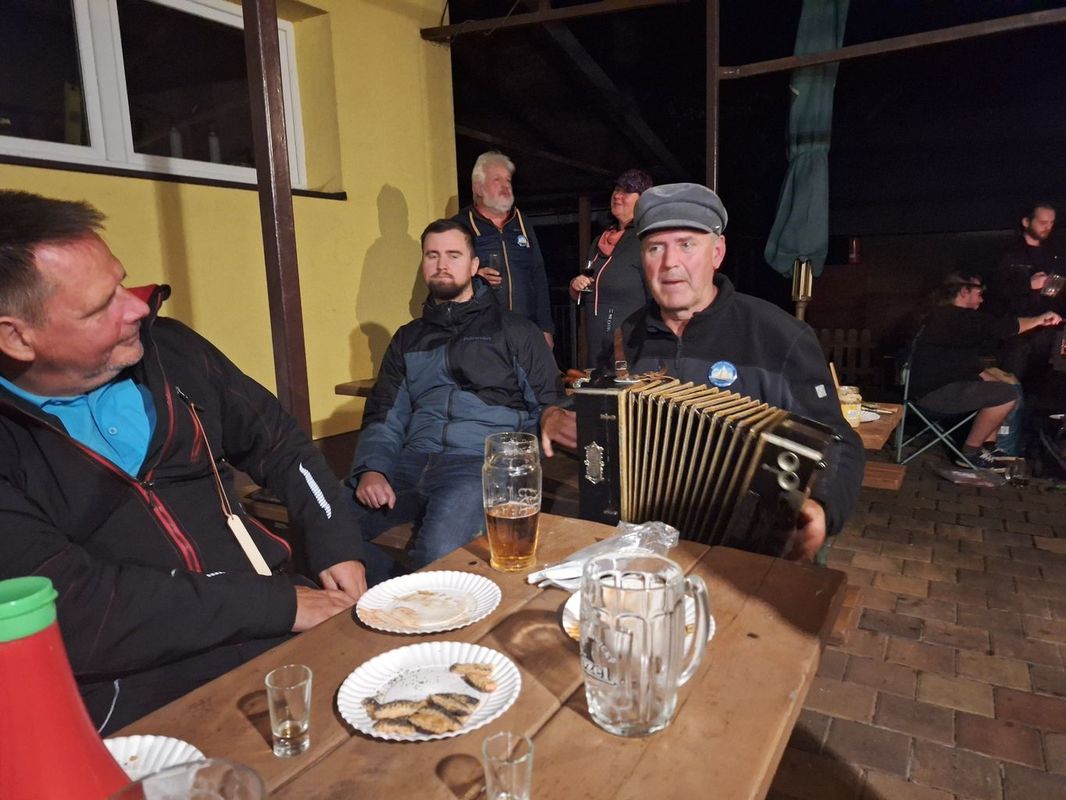 Večer probíhá v komorní atmosféře u stolu v hospodě. Pivko, Zdendovy jednohubky, preclíky, příjemné tlachání. Pavel Strenk nás opouští a jede domů. Prý nám uvaří na zítřek zelňačku a upeče něco sladkého. Vydrželi jsme si povídat asi do půlnoci. Pak jsme se rozešli spát. Někteří do chatek na druhé straně zátoky, někdo jako já či Zdenda do auta. Zavrtal jsem se do spacáku a rychle usnul.