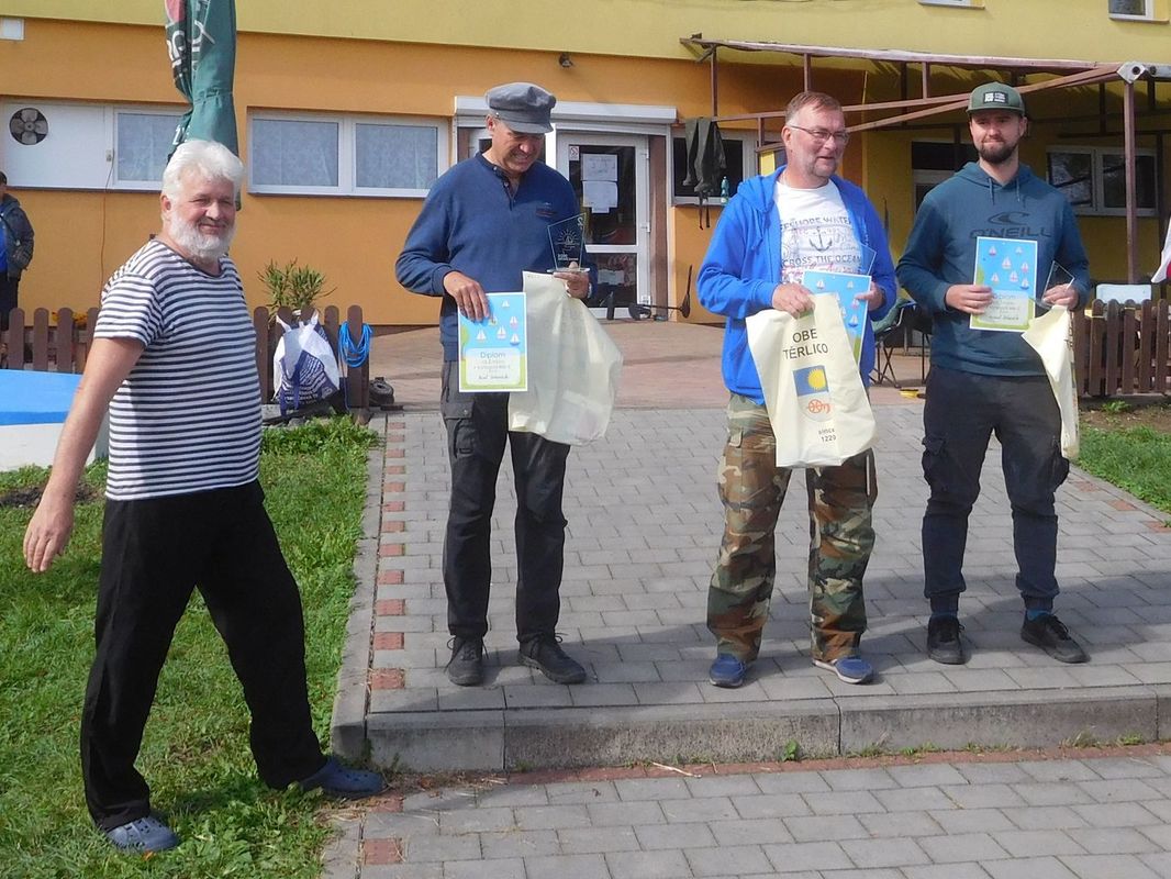 Zaujal mě start regaty. René vypouštěl lodě každou půl minutu v opačném pořadí, než v jakém lodě dojely předchozího dne. Takže kdo byl včera poslední, dnes startoval jako první. Jinak se jel klasický trojúhelník. Jen byl patřičně roztažený do šířky. V 11 hodin bylo dobojováno a lodě postupně projížděly cílem. Všichni začali postupně skládat lodě a pořadatelé uklízet trať a vypisovat diplomy. Také jsem si naložil loď do auta a všechno si sbalil na cestu. Pak jsem si dal ještě česnečku s chlebem, které tu zbývalo ještě tak půl kotlíku.