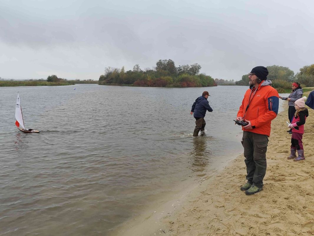 Na nás čekal trochu rozpláclý kosočtverec umístěný na slepé rameno řeky Nidy. Přičemž startovní i vrcholová bójka byly poměrně blízko břehu – u startovní hrozilo uvíznutí na písčité mělčině, u vrcholové zejména při nečekaném poryvu při zadním větru vybočení do rákosí na druhém břehu. Tam ale nebylo jen rákosí, byl jsem tam pro jednu NSS 650, podél břehu v šíři asi 2 m rostly lekníny, do kterých se plachetnice mohla zamotat ještě dříve než do rákosí. Jak je zde zvykem, závodníci se při průjezdech hlásí číslem, 7 Čechů většinou česky, a rozhodčí pobavil Marek Stala, který se přidal k českému hlášení a pravidelně hlásil česky osm, místo polského osiem. Během první rozjížďky vítr ani na chvilku nezmírnil, takže vyhlášených 7 kol (z důvodu větru se počítal počet kol jen ze 40 minut) měl Tomáš za necelých 25 minut. V podobném tempu jen s jedním předjetím Tomášem Jakešem byl René Walenta a za ním pak ještě Franta Chmelka. Marek Stala pak ještě s jedním předjetím navíc. Ostatní jsme bojovali s poleháváním na vodě, doplňováním vody do trupu a podobně. Já jsem dokázal udržet Lonu v relativně vzpřímené poloze jen při ostrém stoupání proti větru, kdy většina síly větru sklouzla po plachtách a jen minimum zůstalo na pohyb vpřed. Při vypadnutí z tohoto ideálu však vítr plachetnicí s přitaženými genami smýkl tak, že plachetnice ležela hned na vodě a většinou byla odhozena zpět po větru o pár metrů. Když dokončily první čtyři plachetnice, měl jsem odjeté jen tři nebo čtyři kola. Zbylí tři Pavel Strenk, Petra a Veronika Kotlárová už boj také vzdali, takže jsem nezdržoval dojížděním v naději, že další jízda bude v trochu slabším větru. Pavel odstoupil se zlomeným ráhnem vratiplachty, Petra se zaplaveným nefunkčním navijákem a Veronika s příliš mnoho vody v podpalubí. Předpověď počasí slibovala nakonec spíše zhoršení, takže se hned jela další jízda NSS open. Začala v podobném duchu se silným větrem, první tři byli natolik rychlí (už nás nenastoupilo osm), že se vyhlásilo osm kol. Po asi deseti minutách se vítr trochu zklidnil na 3-5 m/s, takže se alespoň chvílemi dalo rozumně plachtit. Po 30 minutách dokončil osm kol Tomáš a vítr opět zesílil. Do té doby jsem i já z šesti kol měl asi čtyři relativně poklidné. Předposlední, a nakonec i část posledního byl opět boj s poleháváním na vodě. V posledním kole při opakovaném přibližování k první bójce, vždy po propadnutí při pokusech o obrat, jsem si všiml, že mám nějak moc zanořenou záď plachetnice. Naštěstí jsem už byl po obratu u zadního břehu a křižoval směrem k sobě. No nakonec bylo rameno řeky přeci jen široké a asi 10 m od břehu se začala zanořovat vratiplachta a plachetnice zastavila. To už jsem se začal svlékat a vyrazil jsem pro ni. Když jsem k ní doplaval (teplota vody i vzduchu 12-14 °C, vítr okolo 6 m/s), už zbývala nad vodou jen špička. Takto daleko od břehu byla hloubka okolo 2 m, takže jsem asi 4m musel s plachetnicí plavat, teprve potom šla poponést ve vodě ke břehu a tam vylít vodu z trupu. Cestou do vody, ani později na břehu mi zima nebyla, jen v prvním okamžiku vynoření a ofouknutí větrem. Takže jsem si letos prodloužil koupací sezónu ve středoevropských venkovních vodách – od 23.5. (Bakov) do 11.10.2025, pokud tedy nepočítám pobyt v kalhotách ve vodě do pasu na Kristýně 4.5.2025.