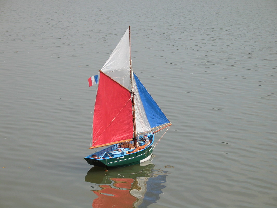 Kategorie NSS-B, tedy čnělkové a lugrové oplachtění a pouze předozadní plachty, byla pro mne přitažlivější. Tady už (aspoň podle mého názoru) nebyla ani jedna z lodí ze stavebnice. Jejich autoři si dávali velkou práci s provedením a místy šli opravdu do detailů. Fascinovala mne například loď RED ATEO, rybářský kutr pana Abela z Bratislavy. Na palubě se povalovaly bóje značící položené sítě, vrše na úlovek, otevřená krabice s nářadím, sudy a také lodní vědro na splachování paluby…. Posledně jmenovaná maketová parádička, vědro, se při jedné z jízd dostalo do vody (sestřeleno ráhnem vratiplachty) a celá jízda byla zatížena tímto nedobrovolným „hendikepem“. Naštěstí provaz vydržel celou jízdu a nedošlo ke ztrátě. Na obrázku je visící vědro na zádi…