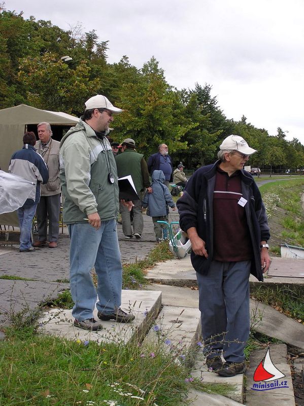 Někteří jsme ustrojili lodě, někteří je rovnou vyndali z aut a šlo se na vodu. Vlny byly malé, trať dokonale přehledná, podél vody široký, bezpečný asfaltový chodník. Osobně jsem se s nikým nesrazil, nic nerozšlápl. Na jednom konci trasy, u pravé bóje pořadatelé dokonce napnuli síť, která odchytávala závodníky příliš zaujaté řízením svého plavidla. Vítr byl ostrý, což některým dělalo starost, některým radost. Chvílemi foukalo opravdu hodně a první to odskákal Milan Kroupa s Endeavourem. Náraz větru mu prudce přehodil hlavní plachtu, pod palubou praskla spojka a byl konec. Milan zahudroval a začal skládat Atlantise, taková záloha je opravdu dobrá věc. Pro druhé kolo zůstaly lodě na vodě, Milan přihodil Atlantise a jelo se dál. Třetí kolo jsme zvládli pod dozorem místní labutí rodinky už za lepšího počasí v sobotu odpoledne. Výsledky jsme se dozvěděli druhý den, ale můžu něco prozradit už na tomto místě - pořadí NSS-A: Jakubík/Atlantis, Chmelka/Trigger, Zapletal/Sea Wind, NSS-B: Emler/Thalassa, Kroupa/Atlantis, Šimůnek/Dove. Obzvláště Karel Šimůnek, obtěžkán svou novou a tentokrát fungující vysílačkou měl velkou radost z oznámení „Karle, jsi v cíli!“