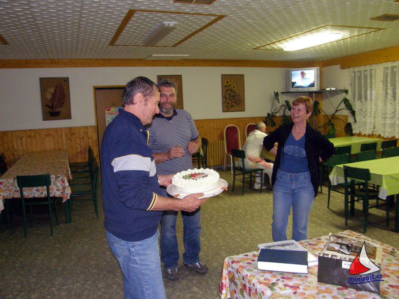 První účastníci se v kempu v Jinolicích objevili už ve čtvrtek, aby v pátek mohli připravit prostor pro páteční regaty. A tak, když jsem se v pátek odpoledne objevil na místě, přivítala mne vodní hladina po které se prohánělo několik plachetnic. První stisky rukou a radost ze setkání s lidmi, kteří postupně dojížděli - to byla pro mne náplň pátečního odpoledne a podvečera. Během večeře v místní restauraci jsme se stihli všechni podepsat na diplom - certifikát, stvrzující že Michal se stal Osobností Minisail CZ roku 2009. Pak list stačilo zasklít a do dárku, knížky, napsat věnování a z auta vybalit dort s logem Minisail.cz (díky Lenko). A tím bylo vše připraveno k oficiálnímu předání Michalovi.
