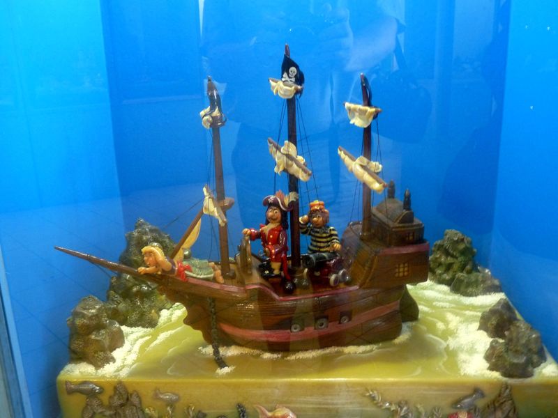 A tam to pánové bylo… Pirátská loď s kapitánem Flintem, kormidelníkem a plavčíkem na čelenu.