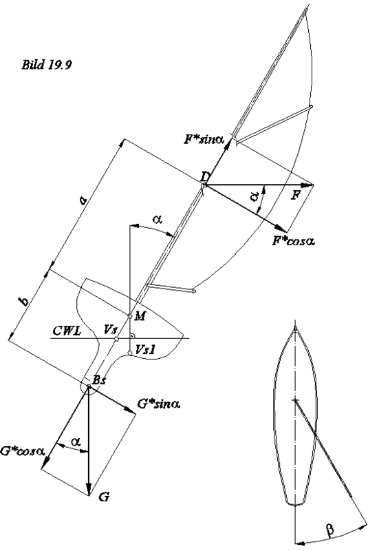 Jinak z plánu oplachtění je pro příčnou stabilitu (aby se loď nepřevrátila na bok) důležitá podle mě jen výška těžiště plachet nad metacentrem lodě (pro zjednodušení tím metacentrem bude vodoryska i když to není úplně přesné – metacentrum se mění s náklonem lodi). Ta výška těžiště nad vodoryskou je vlastně jedno z těch ramen houpačky o kterém jsme se bavili výše. A vodoryska představuje čep kde se ta houpačka otáčí. Na tobě je najít správnou délku toho druhého ramena (kýlu) se správnou hmotností.