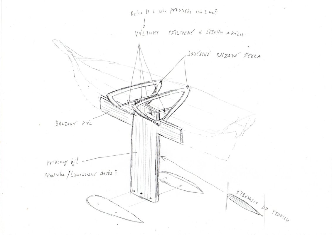 Ale při pohledu na Tvůj téměř hotový trup mě napadá myšlenka, jak tam připevnit takto dlouhý přídavný kýl tak, aby to bylo pevné a nehrozilo nějaké poškození trupu. Přeci jenom to bude relativně dlouhá páka. Kýl máš zhotoven také z balzy, že?