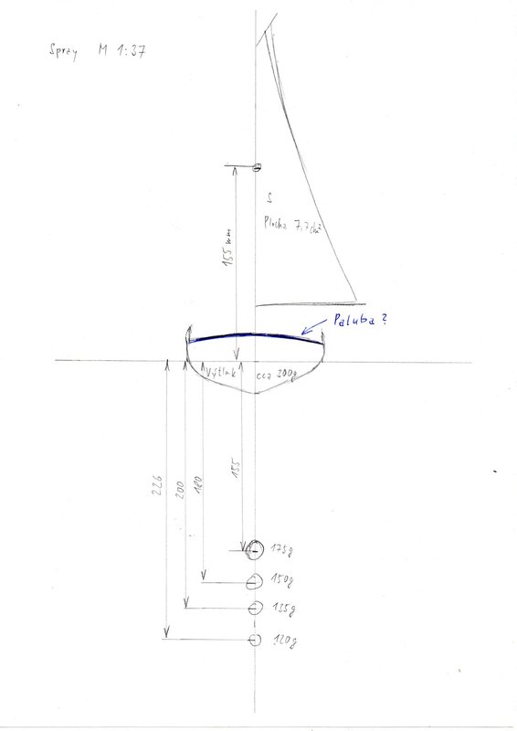 Zkusil jsem to aplikovat na Tvůj model Spray. V měřítku 1:37 má výtlak cca 300g, plochu plachet cca 7,7dm s těžištěm plachet asi 15,5cm nad vodoryskou…