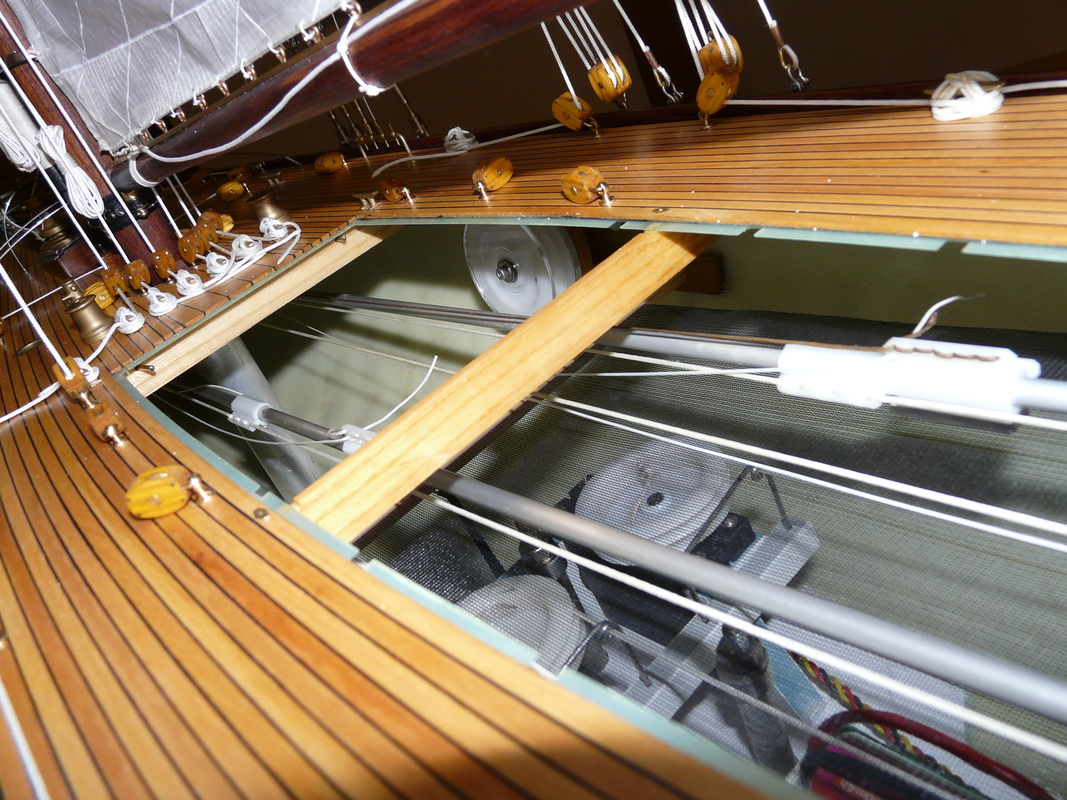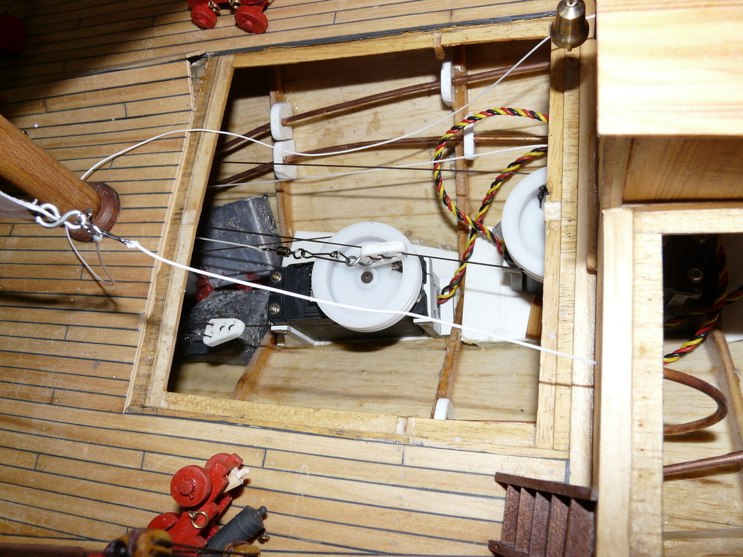 K Tvé strojovně. Dělal jsem si takový malý průzkum, jak jsou ovládané různé menší modely plachetnic. Footyny, Micro magic, apod. Nepřekvapivě servem s dlouhou pákou. Hodím Ti sem pár obrázků abys chytil inspiraci, ale je toho plný internet. Stačí pohledat…