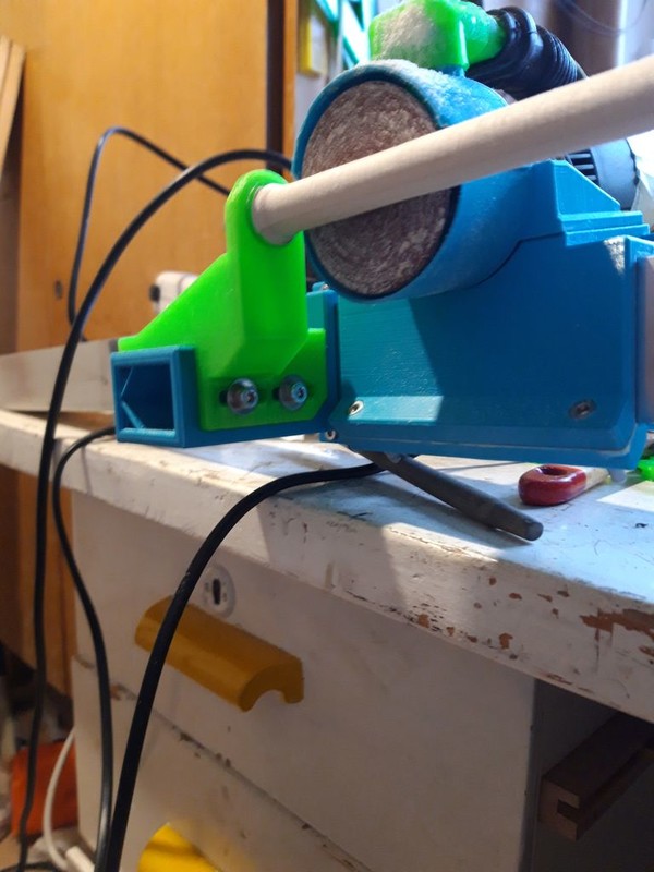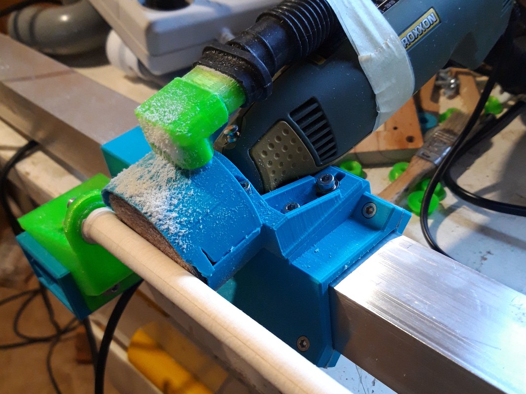 Medzi oboma konzolami je na jekláči posuvne prichytený bežec z niekoľkých častí. Navrhnutý je z troch dielov navzájom spojených skrutkami M4. Spoje medzi dielmi sú volené pod uhlom, takže vložením tenkej fólie (napr. lepiaca páska) je možné dodatočné doladenie tesnosti bežca na jekláči a dosiahnuť potrebnú malú vôľu. Na bežci je posuvne prichytená vrtačko brúska Proxxon (100 W, 230 V). Skúšal som aj slabšiu verziu, ale evidentne nestačila a po pár sekundách bola nepríjemne teplá. Vrtačko brúska má upevňovaciu objímku priemeru 20 mm, pomocou ktorej je prichytená dvoma skrutkami M4 o posuvné sane. Tie nám po povolení štyroch skrutiek M4 umožňujú priečny pohyb vrtačko brúsky a tým aj nastavenie potrebného priemeru výsledného prvku. Na kryte brusného kotúčika je navrhnuté pripojenie odsávania aké používa Proxxon.