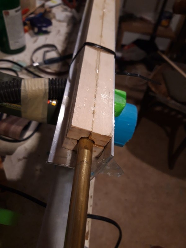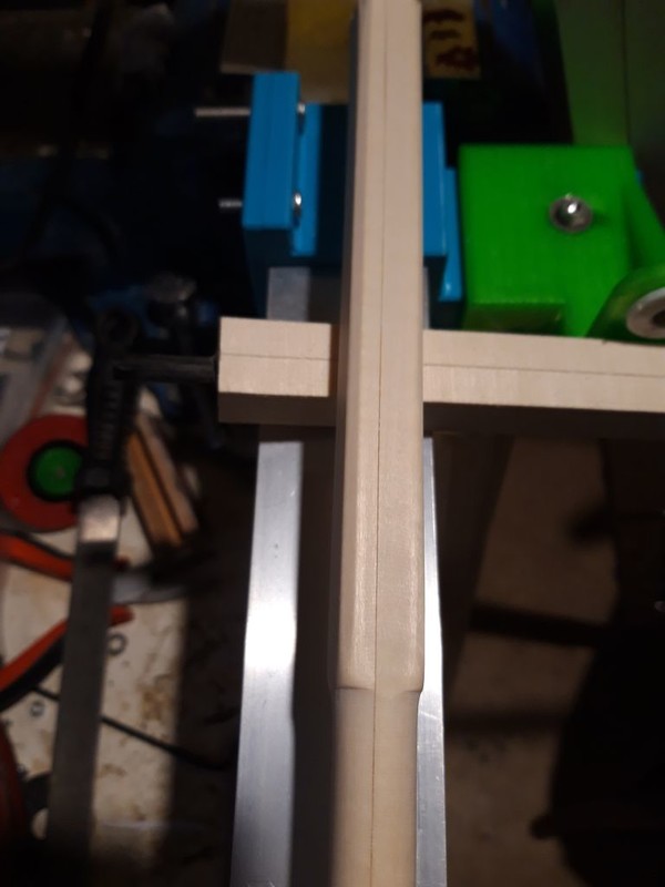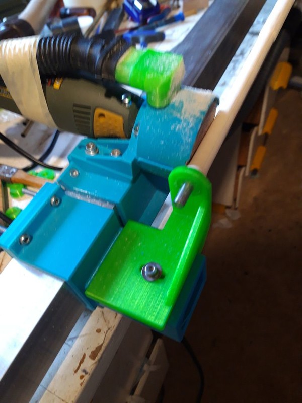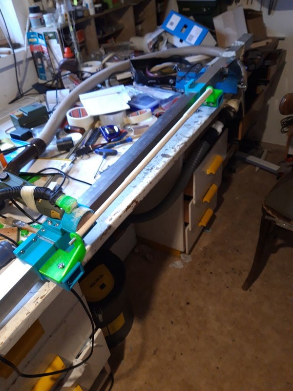 Ručné hobľovanie a brúsenie do okrúhleho profilu je namáhavé a výsledok nie vždy perfektný. Dnes už nemám toľko výdrže v prstoch, tak som sa rozhodol že si to zjednoduším a preto som si navrhol a zhotovil „stroj“ na ich brúsenie. Základ stroja je hliníkový profil jekláč 40x40x2 mm dĺžky cca 2 m. Na tomto profile sú na oboch koncoch prichytené konzoly, ktoré je možné po povolení štyroch skrutiek M4 pozdĺžne posúvať po jekláči. Na týchto konzolách sú posuvne prichytené držiaky (zelená farba) troma šrubami M4, do ktorých sa vkladajú konce polotovaru na stožiar, alebo ráhna. Za tým účelom je potrebné aby uhlíkové trubky prečnievali za lipové lišty minimálne 20 mm. Trubky sú tesne vsunuté do plastových prechodiek, ktoré sú otočne vložené do otvoru v držiaku (zelená farba). Plastové prechodky mám vyrobené viac druhov podľa priemeru uhlíkových trubiek. Posúvaním držiakov po konzolách nastavujem rovnobežnosť s pozdĺžnou osou ekláča, prípadne nastavujem potrebné zúženie na vrchole sťažňa. Do uhlíkovej trubky, ktorá prečnieva za lišty je epoxydom vlepená drevená výplň, aby trubka nepraskla.