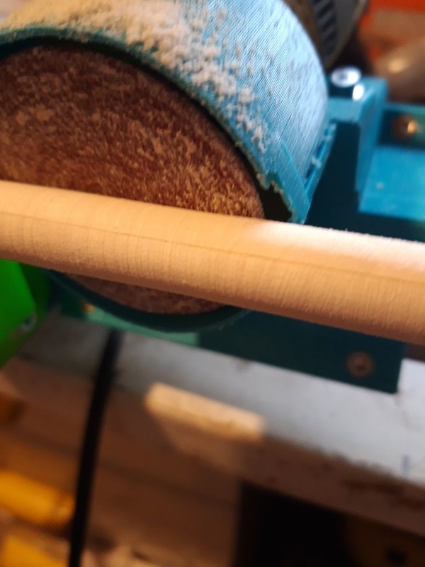 Samotné brúsenie prebieha po nastavení potrebného priemeru a zošikmenia, posúvaním bežca po jekláči. V krajnej polohe pootočím polotovar o niekoľko stupňov a pokračujem naspäť. Po otočení o jednu otáčku (teda celého obvodu prvku) musím uvolniť štyri imbusové skrutky na sniach a posunúť ich do záberu. Pokračujem zas v brúsení ako predošle. Po niekoľkých prestaveniach sa postupne dostaví skoro kruhový profil, na ktorom je vidieť hranatosť. Na základné brúsenie používam brusný kotúčik Proxxon Ø 50 mm, zrnitosti 80. Na finálne dobrúsenie používam kotúčik zrnitosti 150, ktorým obídem celý profil radšej dvakrát, aby som čo najviac odstránil pozdĺžne plôšky. Je potrebné sa vyvarovať otáčaniu polotovaru v držiakoch za chodu brúsky a pri stojacom bežci, pretože sa v mäkkom dreve vytvoria priečne rýhy, ktoré sa ťažko odstraňujú.