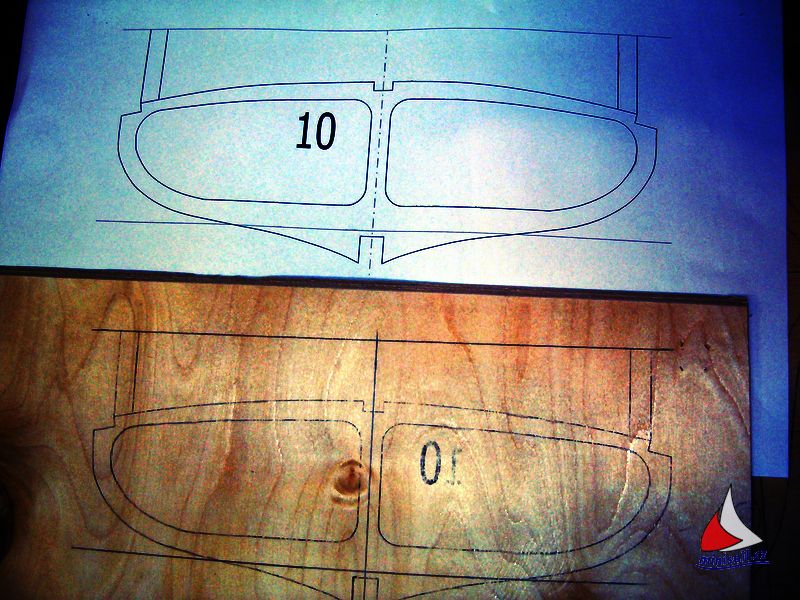 Žebra nakreslená (se správnými průniky), vytištěná na laserové tiskárně, jdou dobře přenést přežehlením, pokud není překližka příliš chlupatá. Vyřezání přímočarou pilou jde dobře, když se použije správný nástroj.