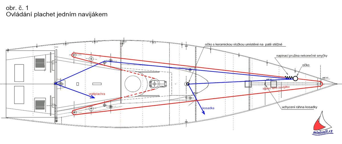 Nekonečná smyčka je vykreslena červenou barvou je vedena z navijáku přes trubičkové průvlaky v nadstavbě paluby na kladky, které jsou i na předloze. Napínání nekonečné smyčky je zajištěno pružinkou ( případně gumičkou, velmi se osvědčila tenká silikónová bužírka dříve používaná v elektrotechnice). Očko do kterého jsou uvázány jak otěž hlavní plachty tak i ráhna musí být na tažné straně nekonečné smyčky. Pro ovládání používám levý křížový ovladač, páčkou k sobě přitaženo a od sebe maximální povolení hlavní plachty i kosatky. V tomto směru je na ovladači vyřazena neutralizace. Část nekonečné smyčky, která je pod palubou je naznačena čárkovaně. Dále je třeba dbát míry pro uchycení obou ráhen a jejich otočných bodů, tak aby se otevírala rovnoměrně a byl udržován úhel nastavení mezi kosatkou a hlavní plachtou. Nutno je též počítat se seřiditelností otěží. Ale to je