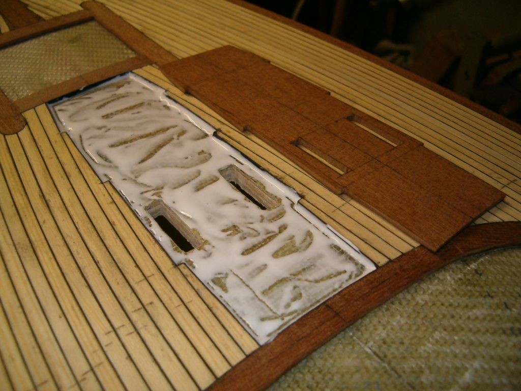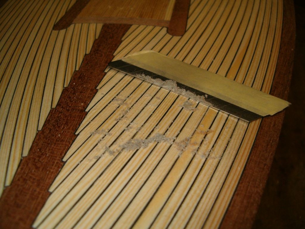 Tomáš a teď já pokládám palubkovou palubu na laminátový podklad, i lišty lepím epoxidem většinou po několika lištách, takže se mi osvědčilo pro skládání a dopasovávání nasucho nalepit na laminátovou palubu oboustrannou lepící pásku. Jinak na spáry se dá v lepším papírnictví koupit barevná čtvrtka (180g) ve velikosti A4 i A3 v různých barvách, zkoušel jsem i okr v kombinaci s lištami se sraženou hranou jako imitaci svislých palubek na nástavbu.