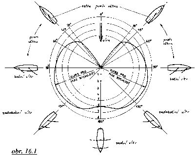 Dalšími prvky, které je zapotřebí nacvičit, jsou obraty. Oproti očekávání většiny začátečníků je u lodí s předozadním oplachtěním jednodušší a bezpečnější obrat proti větru, kdy loď prochází přídí větrem. Má-li loď dostatečnou rychlost a jedná-li se o rychlý a všeobecně “jezdivý” typ, stačí k provedení obratu proti větru řídit model pouze kormidlem. Lodi s bachratějším trupem a tím i větším odporem musíme v jejím snažení pomoci přitažením plachet. Modely lodí s ráhnovým oplachtěním se při obratu proti větru chovají stejně neochotně jako jejich předlohy, většinu z nich bez pomocného motoru proti větru nedokážeme obrátit vůbec. Při obratu proti větru jede loď po určitou dobu pouze setrvačností, přičemž její větrný pohon působí jako odpor proti jejímu pohybu. Je-li hmotnost a rychlost lodě malá a její čelní odpor velký, nastávají potíže. Nemá-li model dostatečnou rychlost, pomůžeme si odpadnutím od větru. Po nabrání rychlosti (viz. diagram na obr. 16.1) je zpravidla možné obrat provést.
