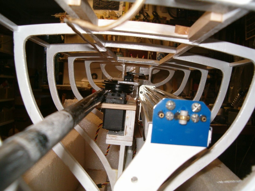 Slepil jsem kokpit z laminátu a vyvrtal otvor pro osu kormidla. Osa kormidla je kolmá, aby se mechanismus řízení dal schovat pod falešnou podlahu. Zbytek osy kormidla vystupující z trupu je zalomen kardanem do úhlu podle předlohy. Zajímavá je geometrie táhla kormidla, která umožňuje minimální boční pohyb táhla v prostupu gumovou průchodkou.