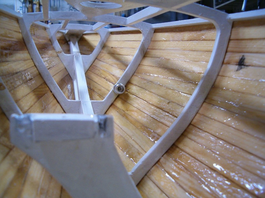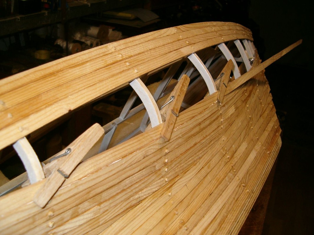 Začal jsem sháněním podkladů, kterých je naštěstí na internetu hodně. Zvláště obrázky a krátká videa na YouTube. Porovnáváním plánků polských, francouzských a fotografií se začal rodit počítačový výkres. Z něho pak vznikly podklady pro vyřezání překližkových žeber a páteře na gravírovacím plotru. Stavbu jsem začal v srpnu 2020. Poslepoval jsem kostru letmo, přímo na páteři s oční kontrolou souměrnosti. Dokud byl do trupu přístup mezi žebry, provedl jsem jejich nátěr a umístění mechanismů ovládání. Vše tak, aby se dalo cokoliv namontovat a vyjmout otvorem pod nástavbou. Další operací bylo oplaňkování smrkovými lištami tloušťky 3mm , nařezanými na cirkulárce z odstraněného obkladu. Plaňky jsem předohýbal a překrucoval nad horkovzdušnou pistolí. Polohu na žebrech jsem jistil kolíčky na prádlo, a kde to nešlo, i malými vruty. Na všech žebrech jsem pak navrtal a zalepil kolíček. Vnitřek trupu jsem impregnoval pryskyřicí epoxy 1200 a nejnižší část mezi žebry vyplnil stavební pěnou. Důvodem této operace bylo očekávání, že voda, která se do trupu dostane, nesteče až úplně dolů, ani nezůstane někde za žebry. Vnější část trupu pak prošla broušením a tmelením polyesterovým tmelem na dřevo.