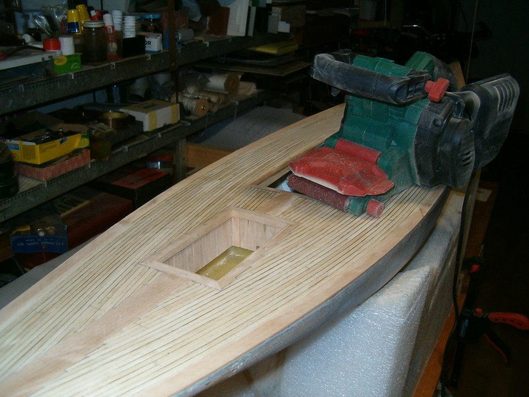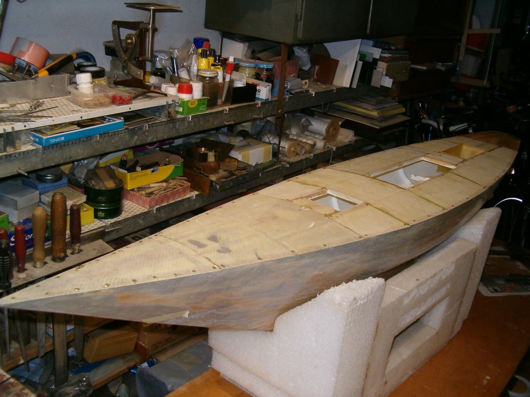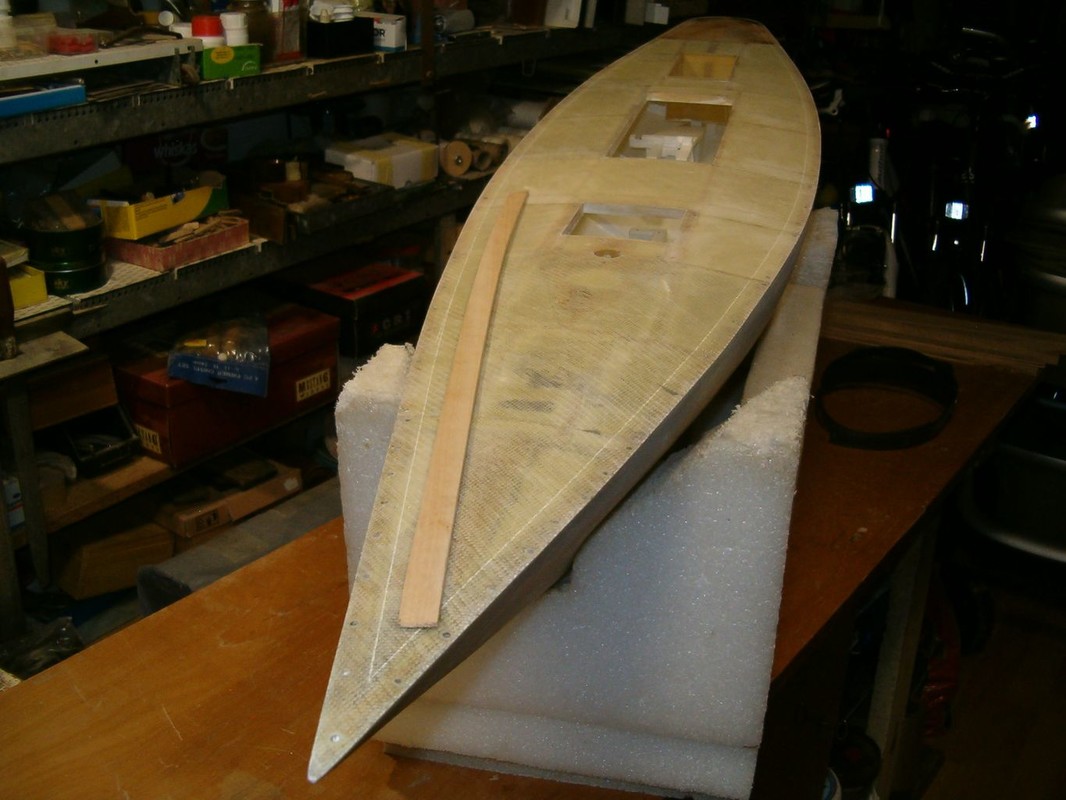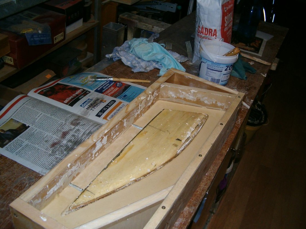 Vnějšek trupu jsem potáhl skelnou tkaninou 300g/m2 nasycenou pryskyřicí epoxy 1200, kterou jsem nanášel válečkem. Následně je trup zatmelen polyesterovým tmelem. Operací mimo loď bylo zhotovení kopyta a formy pro odlévání balastu. Dřevěnou formu jsem impregnoval lepicí páskou. Kopyto jsem ve formě polohoval sloupky s vruty , které korespondují s otvory v kýlu. Sádru jsem naléval postupně a prokládal armaturou z perlinky. Po nalití do poloviny formy jsem nechal sádru vytvrdnout, namastil vazelínou a dolil zbytek. Půlky šly od sebe dobře, zhotovil jsem nalévací a odvzdušňovací otvory. Dlouho jsem pak formu sušil. Kov jsem roztavil na záložním vařiči v kastrolu, kterému jsem naohýbal hubičku. Nalil jsem celou formu najednou. Na opracování mám speciální rašpli a na vrtání a řezání závitů speciální řezný sprej. Jde to jako do hliníku. Pak mohla jít loď do vany. Tam jsem zjistil, že je těžiště moc vzadu, a proto jsem z balastu uřízl 3kg a tvar trochu upravil. Po další vanové zkoušce bylo již vše v pořádku. Budu ale muset za balast doplnit mrtvé dřevo.