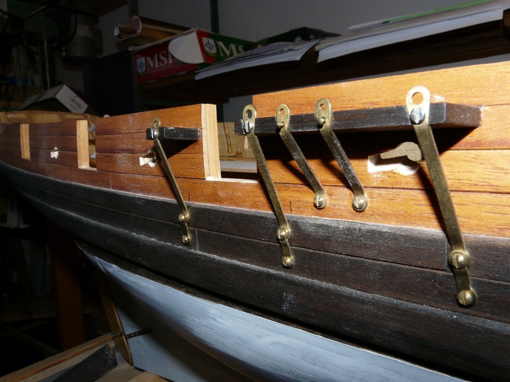 Přibyly otvory pro vesla v bortech mezi střílnami. (obr. 1 a 2). Přestože na žádném známém zobrazení Pickle veslové otvory nejsou vidět, bylo mi řečeno že byly u podobných lodí standard. Při studiu historie předlohy jsem našel také zmínku že použily tyto velká vesla k vyztužení prasklého čelenu. (Než za bouře praskl celý a zmizel v moři.) Takže je měli prokazatelně na palubě. Veslové otvory byly nejčastěji čtvercové ale mohly být i s výřezem pro list vesla, buď na jedné nebo obou stranách. Tato velká vesla nesloužily primárně k pohybu lodě.( I když i to se dalo). Loď se vlekla zpravidla pomocí člunů. Ale posloužily třeba k tomu aby bylo možno loď za bezvětří natočit bokem k blížícímu se nepřátelskému výsadku na člunech nebo dělovému člunu a pokropit je palbou. Nebo v nouzi jako náhradní kulatina...