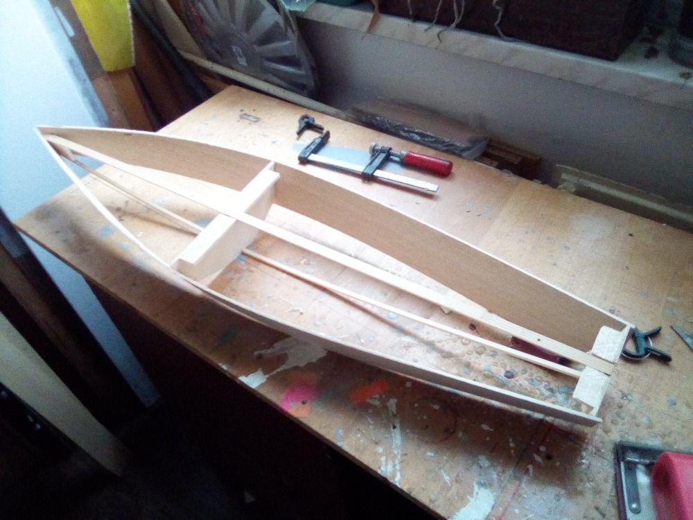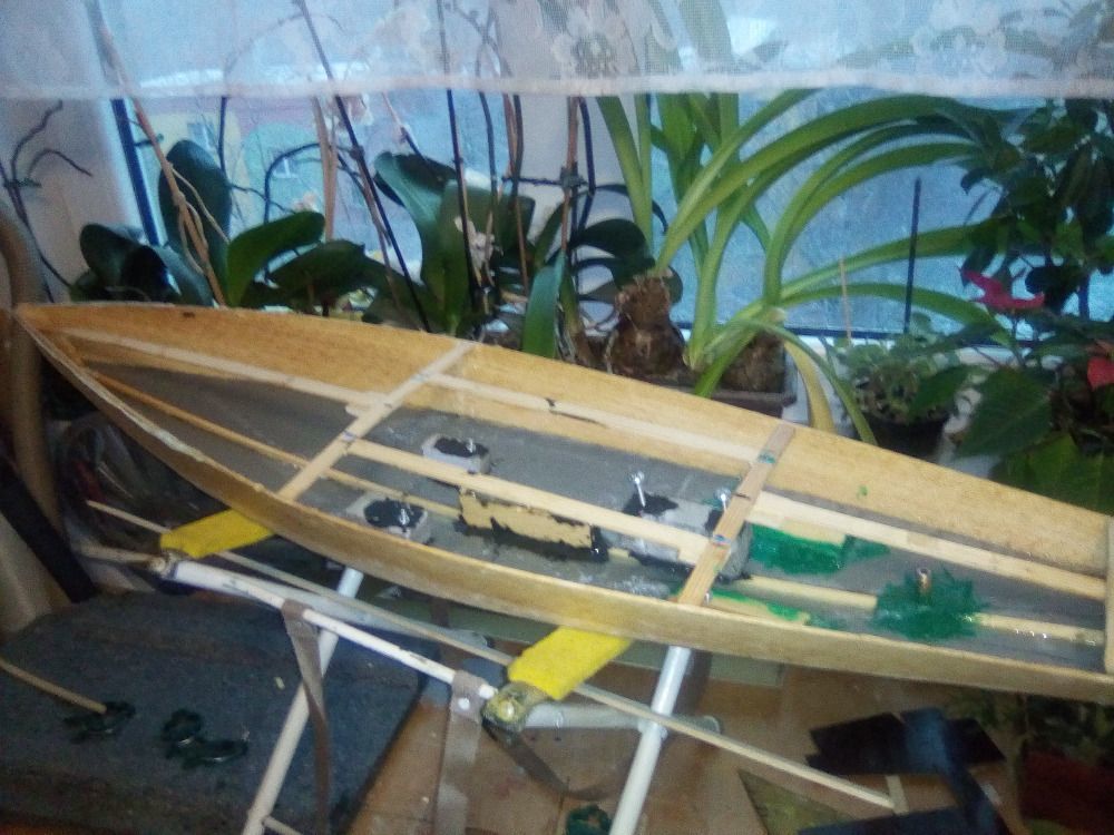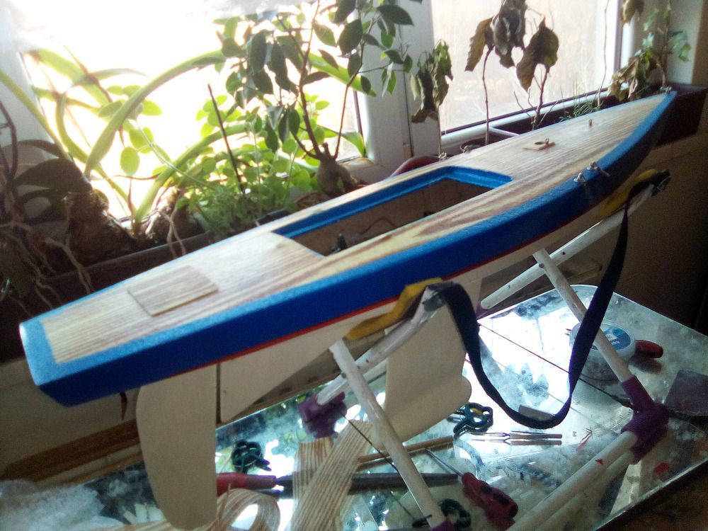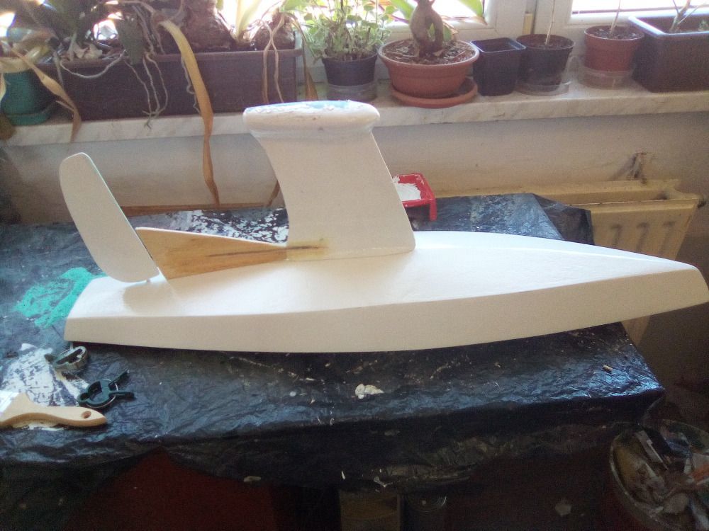 Franta mi poslal pár obrázků a krátký text o stavbě modelu: Ahoj, bočnice jsou z balzy 2mm, délka modelu je dána délkou balzy. Dno je extrudovaný šedý polystyren 20 x 500 x 1000 mm, celé potaženo kepr tkaninou (163g) v jednom kuse (epoxy LH 145). Paluba je z laminátu prohnutá ve formě a povrchově potažená tkaninou od Havla (30g) v barvě dřeva. Servo na plachty (JX SW-5513-6PA 55g/10,6kg), stojí méně než Hitec. Klasická nekonečná smyčka. Otvor je zakryt plexi a zalepen.