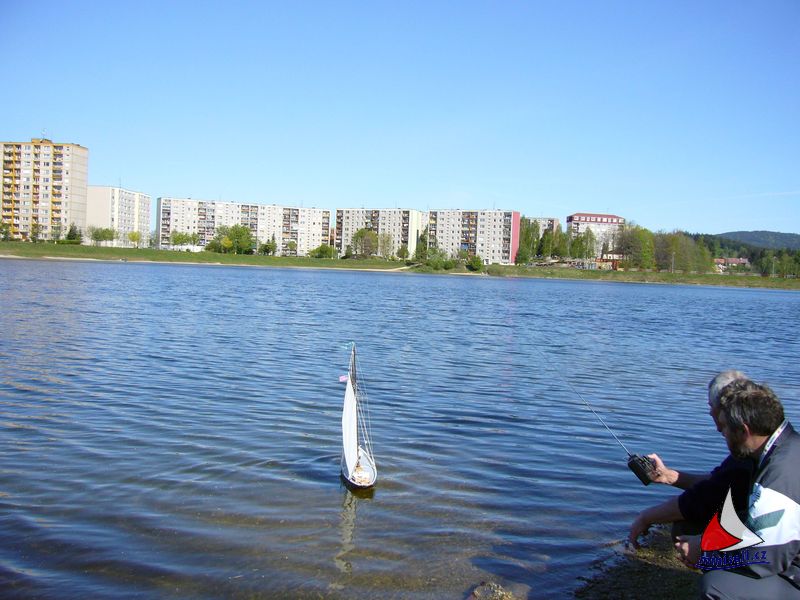 - Podmínky, ve kterých jsme dávali model na vodu nebyly příznivé – vítr vál podél břehu a tak neovladatelný model mohl odnést na volnou vodu.