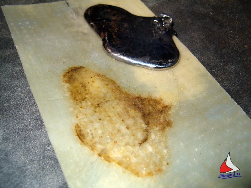 Stavba pokračovala nalitím 6,5 kg olova do ploutve. Nejdříve jsem si udělal zkoušku, co udělá roztavený kov při styku s laminátem. Nic. Ploutev jsem tedy zanořil do kbelíku s vodou . Ta by měla odvádět teplo. Lití jsem prováděl po malých částech a pokračovalvždy, až když vše vychladlo. Dopadlo to podle očekávání. Nebylo potřeba ani opravovat nátěr. Otvor do ploutve jsem pak překryl tenkým laminátem, aby tam nemohlo zatékat.