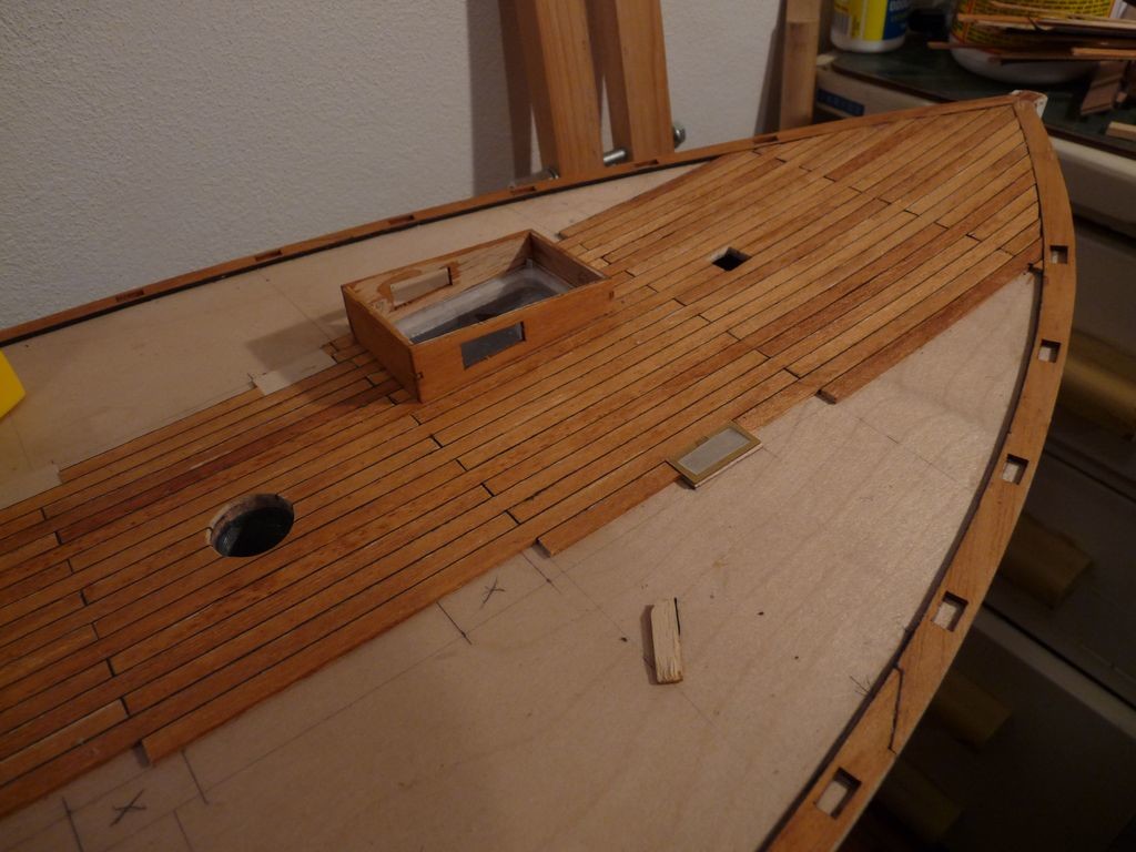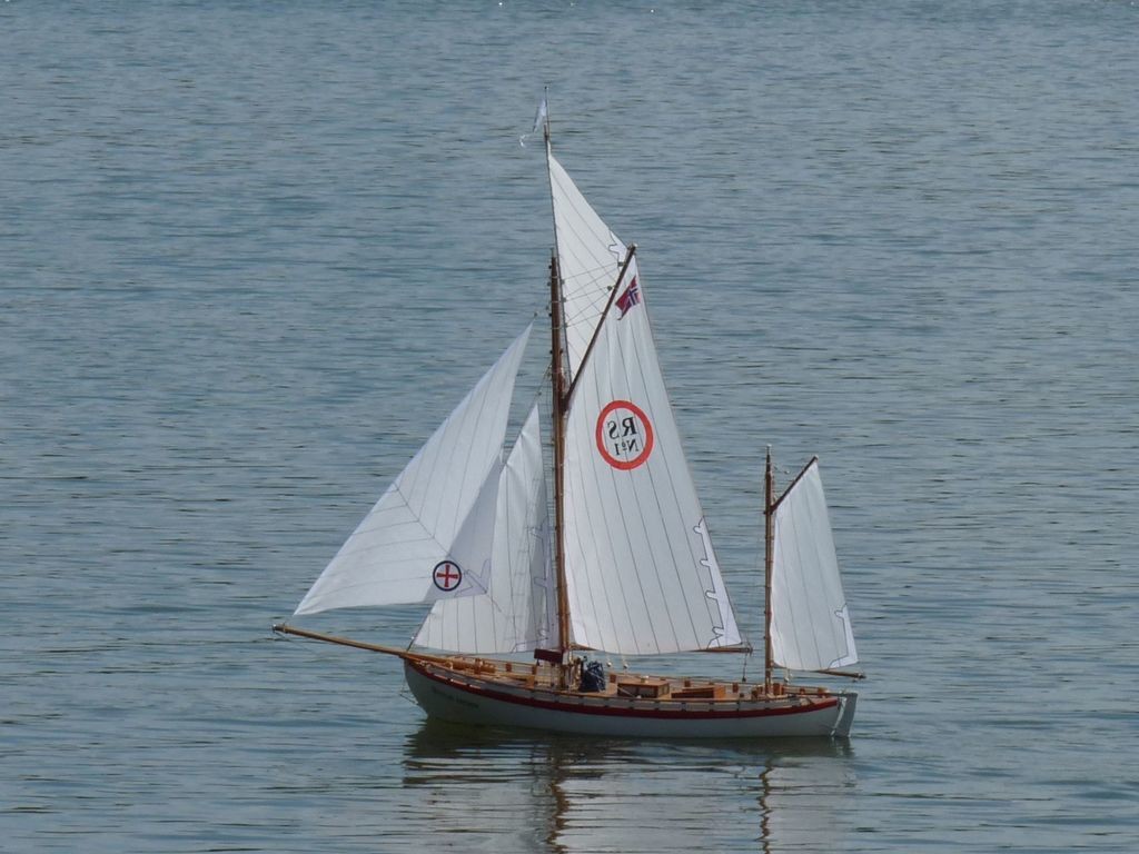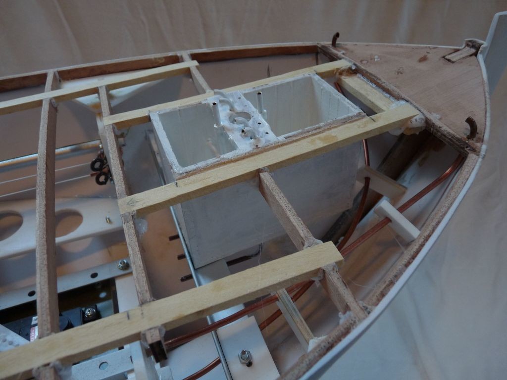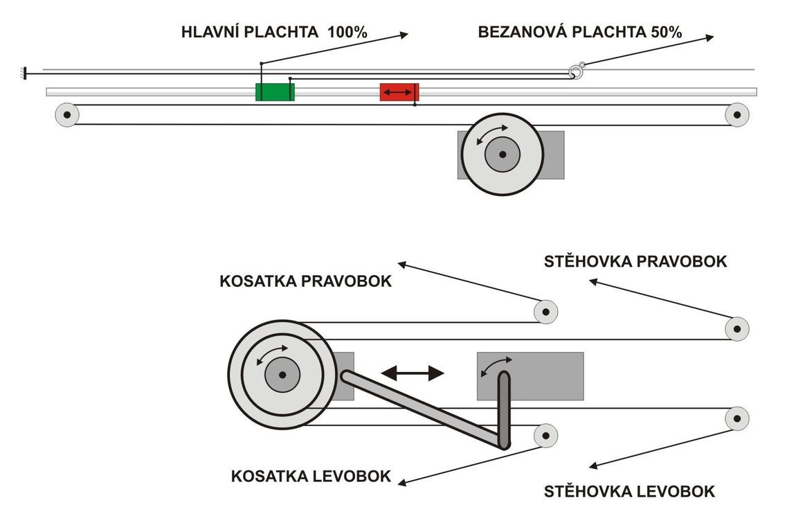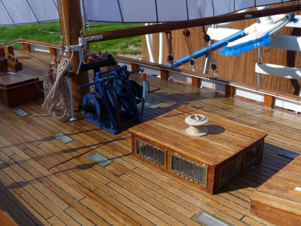 Pro ovládání hlavní plachty jsem použil osvědčený systém vodící tyče, po které naviják přesunuje ovládaný element, zatímco otěž je upevněna k volně pohyblivému elementu. Pokud tedy dojde k přestavení ovládaného elementu (změnou pozice serva) a otěž plachty není v tahu, nic se neděje - volný element zůstane na svém místě, až dokud vítr nepřesune plachty do nové pozice. Tím vytáhne i otěž a volný element se tak dostane na novou pozici - doraz o ovládaný element. Výhodou je, že se v podpalubí nemotají volné otěže. V případě RS01 všechny otěže, ve shodě s originálem, vedou do kokpitu na zádi. Uchycení otěží na hlavní a bezanové plachtě je v poměru 2:1 a tak jsem využil rozpůlení přestavné dráhy otěže bezanové plachty pomocnou kladkou. Ta je realizována v podpalubí kroužkem z rybářského prutu, který jezdí po pomocném lanku (opět prevence zamotání volných otěží).