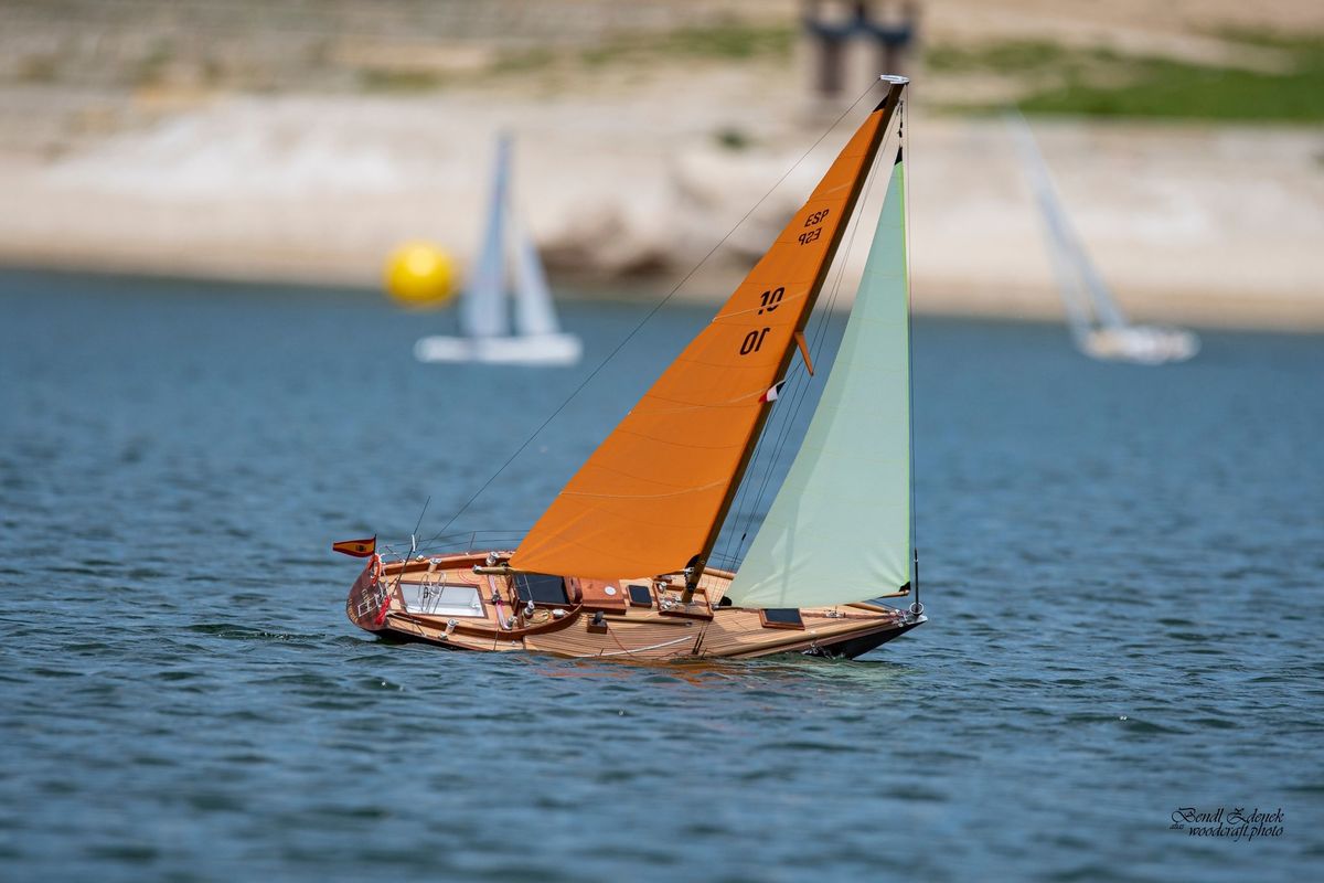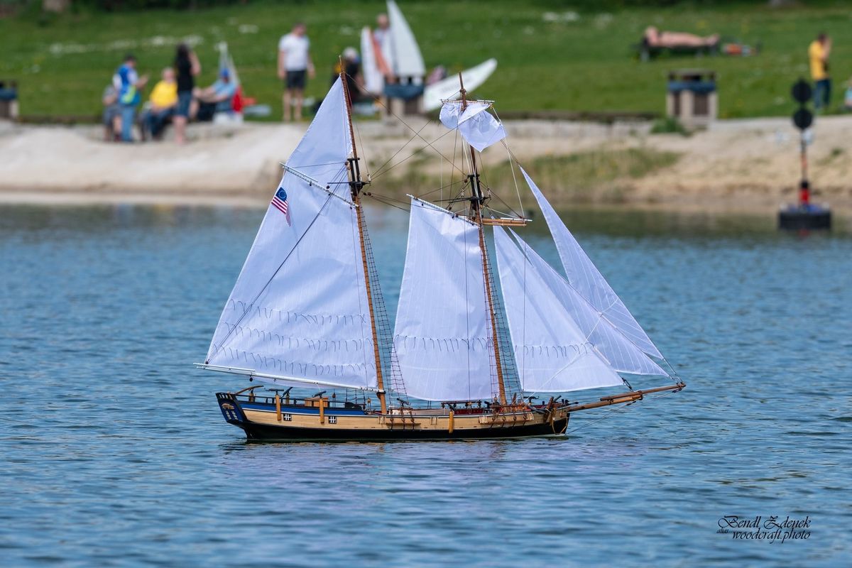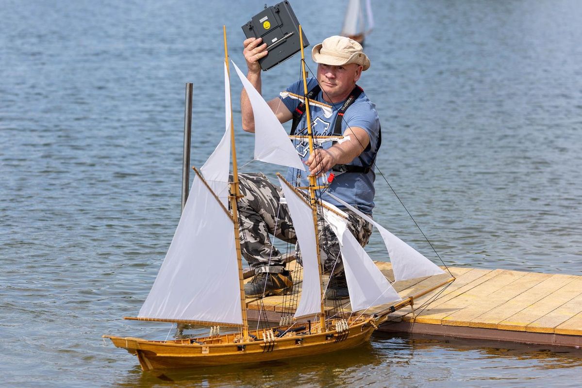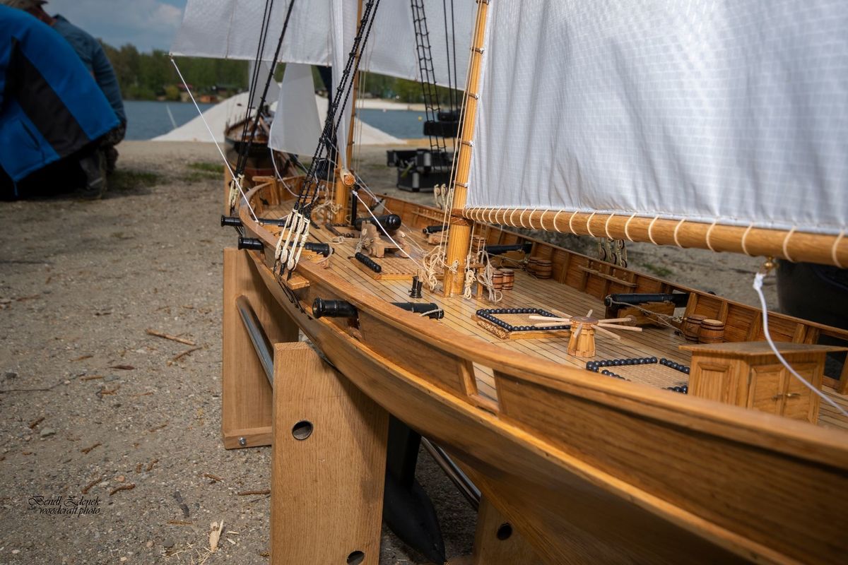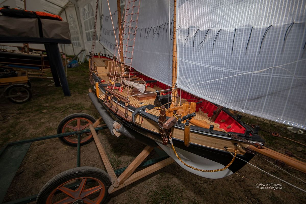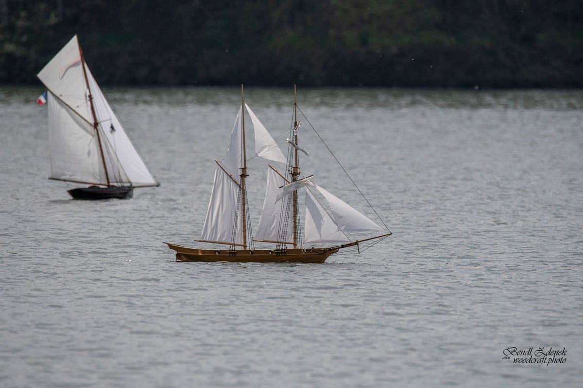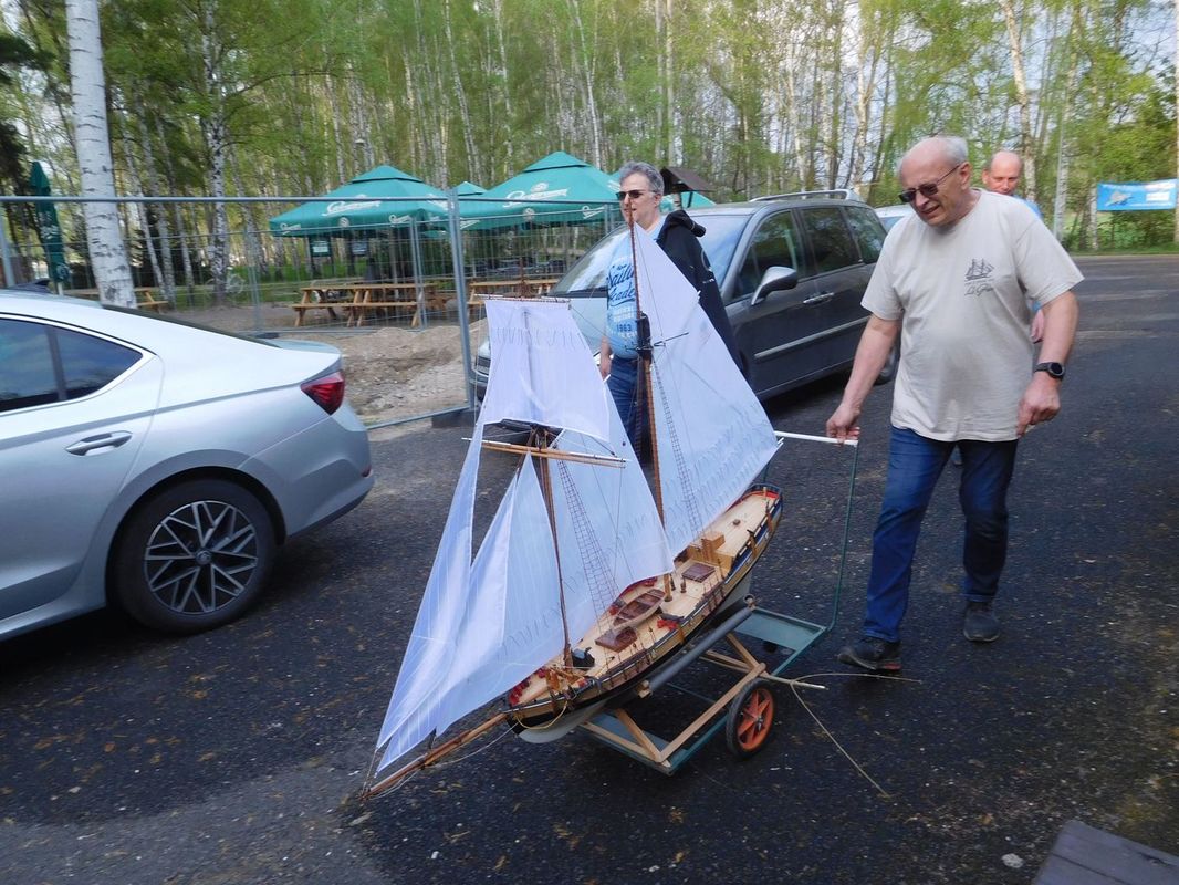 Tradiční páteční mezeru mezi zahájením a první jízdou, způsobenou bodováním modelů jsme vyplnili instalací meterologické stanice. A pak už začal kolotoč jízd. Očekávanou událostí při jízdách NSS-B byla po letech účast dvou modelů, které spadaly svou příčnou plachtou do kategorie NSS-C. Ta se v předchozích letech trochu zvrhla do modelů s moderním latinským oplachtěním. Po deseti letech od období lodí jako La Renard, Sweden Yacht, Elen, Sultana (2012), se objevily dvě nové lodě. Milanova Berbice a polský Halkon. Oba modely jsou Baltimorské škunery a každý nese jednu příčnou plachtu. U obou konstruktéři – modeláři přistoupili k ovládání jediné příčné plachty. Na místě jsem tak mohl přímým dotazem u Borka Dvořáka ověřit to, co je myšleno „ovládáním“ příčné plachty, které musí být na modelu funkční. Odpověď zněla, že myšleno bylo zejména ovládání směrového nastavení ráhna k ose lodi. Ale že vzhledem k možnému rozšíření kategorie by uznal i jen funkční kasání plachty.