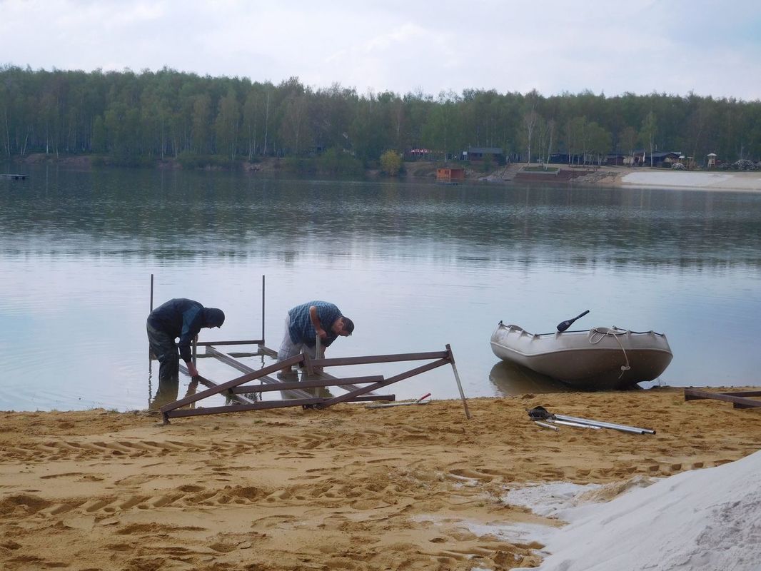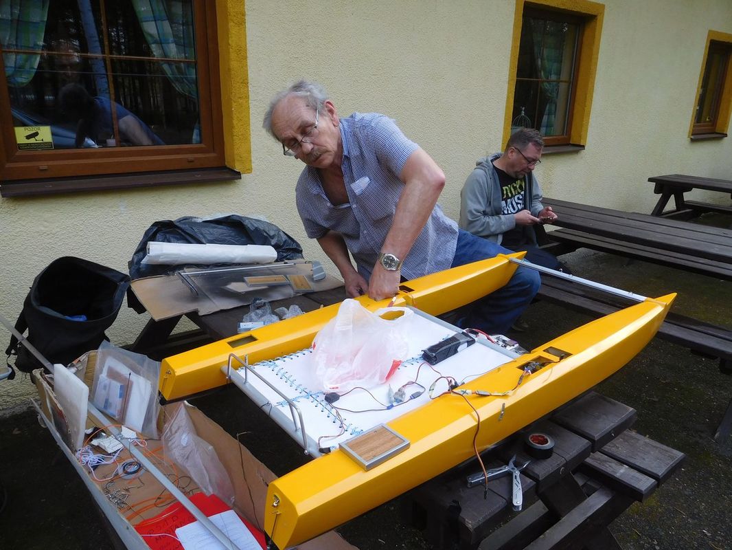 Jako obvykle přípravou startovišť. Jako vždy nejprve stany, pak plata, která přivezl Standa. Dalo dost práce je sešroubovat – inu voda je prevít a šrouby, byť s povrchovou úpravou stačí párkrát namočit a je připraven problém. Naštěstí máme kamarády, kteří mají v autě různé mazací spreje a tak se to nakonec podařilo. Při sestavování majáku nejprve chyběla vyztužovací lanka, ale nakonec se vykulily z konstrukce plováku. Na všem byla vidět dvouletá pauza, co šlo dříve hladce, potřebovalo více času. Myslím to i na sestavování modelů před uložením do loděnice (alespoň podle sebe).