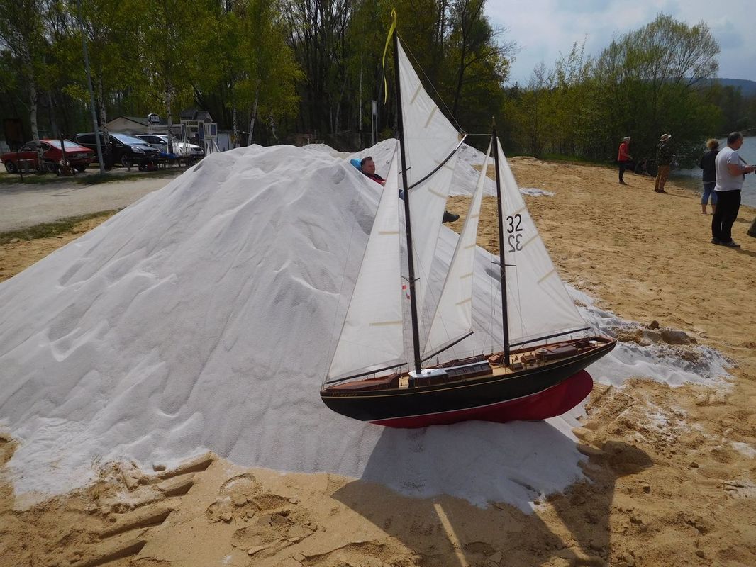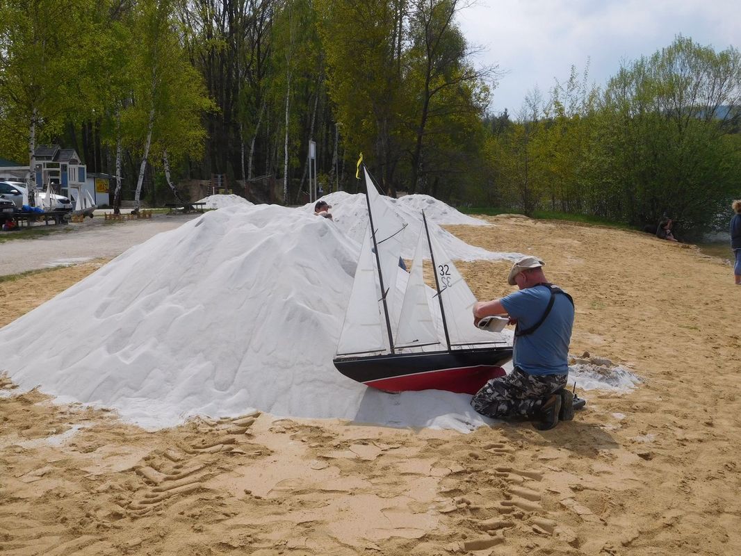 No, byla to ledová sprcha a po loňské Těrlické plachtě hned zase jedna loď na dně. A navíc na Kristýně, kde je hodně hluboko! To se na předchozích deseti setkáních nikdy nestalo a tak jsem ještě během této první jízdy použil telefon pro volání o pomoc Libereckým vodním záchranářům. Ochotně slíbili, že sbalí a naloží věci a později odpoledne přijedou a pokusí se o nalezení a vyzvednutí modelu. Jízdy prvního dne probíhaly dále, ale ten den měl teď už jiný vrchol.