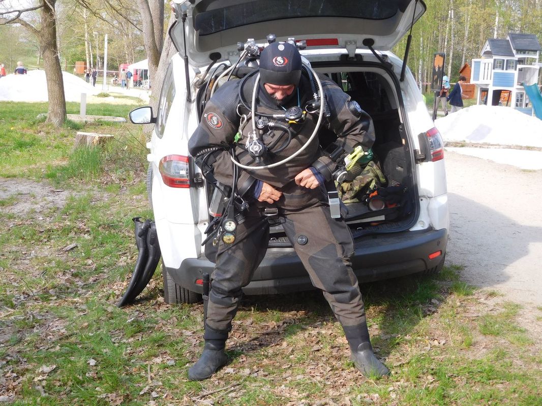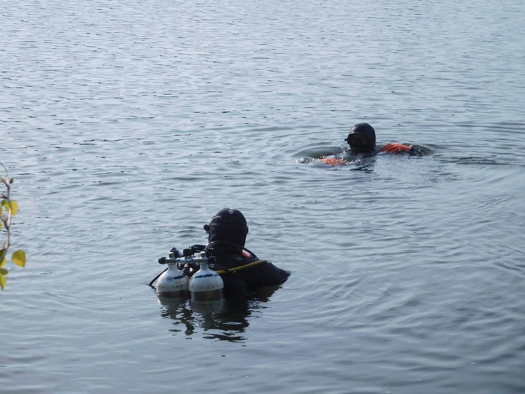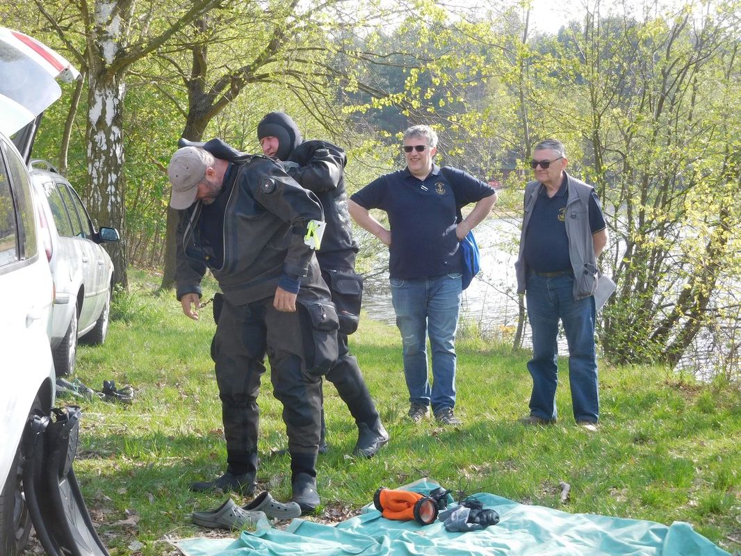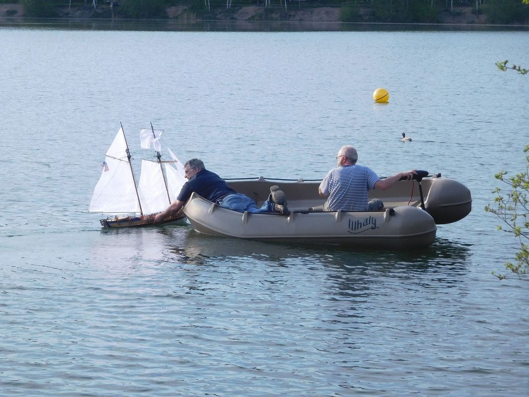 Opravdu přijeli a tak jsme s velkým zájmem sledovali náročnost přípravy na ponor. Naštěstí dno Kristýny velmi dobře znají z mnoha ponorů a tak po vyznačení místa, kde šla Berbice pod hladinu, odhadli hloubku kolem osmi metrů a samozřejmě nízkou viditelnost. Místo bylo vyznačeno bójí a chlapi se mohli začít oblékat do těžkého vybavení. Na břehu si tak každý přiložil cca 70 kg a už jen dojít k vodě musí být výkon. Ale bylo vidět, že je to pro ně známý proces a tak se každý s minimem cizí pomoci připravili k sestupu pod hladinu. Jakmile byli ve vodě, zamířili k bójce nad místem tragédie a zmizeli. Jen občasné bubliny na hladině naznačovaly, co se dole děje. Věděli jsme, že se ve spirále budou pohybovat od vyznačeného místa (lanka bóje) a hledat. Trvalo to snad jen patnáct minut a na vodu vystřelila bójka nedaleko od místa té první. Hurá, loď se našla! Za lanko, upevněné za úchyt čelenu na trupu mohla být přitažena ke člunu a pomalu odvezena k molu, kde byla opatrně vyzvednuta a zbavena vody. Loď byla tedy zachráněna, kompletní, nic neupadlo, ale několikahodinová vodní lázeň samozřejmě modelu neprospěla. Dřevěná paluba a další díly se začaly rozpínat a samozřejmě po vyschnutí bylo teprve vidět velké škody a mnoho práce, než se zase model dostane na vodu. Co bylo příčinou potopení? Velkým náklonem došlo k zatopení podpalubí, to je jasné. Náklon byl umožněn nízkou stabilitou trupu, protože balast byl umístěn v trupu, který nebyl upraven pod čarou ponoru o povolených + 100%. To se bude muset změnit a balast bude muset jít co nejníže…