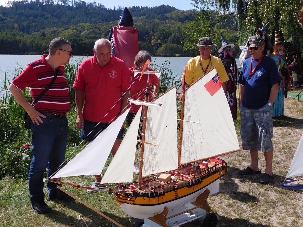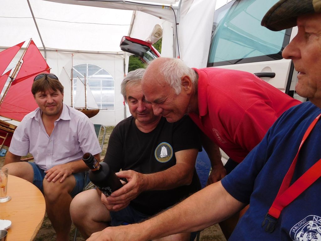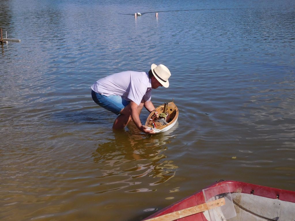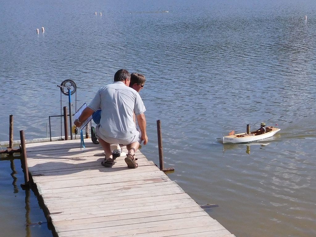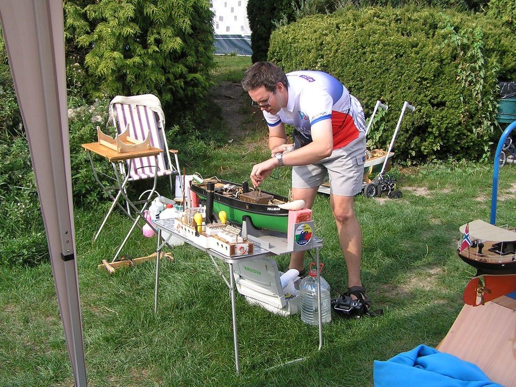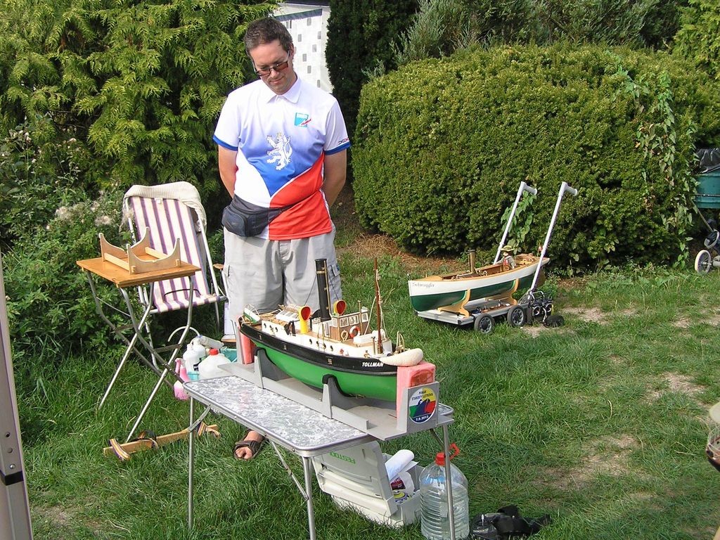 Tradičně nás zajímá i soutěž parníků. Svého Schmugglera přijel namočit Michal Šenekel a také Ladous přivezl svůj paník Tollman. Ten mu zabral tolik místa v autě, že se mu tam nevešla žádná plachetnice. Tak jsme chodili fandit… V šesté soutěži, ve druhé jízdě, při dokování, na Schmugglerovi vzplál oheň. Při té smůle bylo štěstí, že model byl blízko mola. Díky tomu mohl Michal rychle zastavit přívod plynu a hasit oheň zalitím podpalubí vodou. Přesto škody vypadaly docela hrozně. Michal to vzal pragmaticky, vyjmul celý vložený parní stroj a hledal příčinu závady. Dnes už je vše opraveno a také se našlo vysvětlení – příliš velký tlak plynu a nová kartuše, která ve šroubení nedokonale těsnila, postupně zapustila podpalubí malým množstvím plynu, který se při couvání vznítil od hořáku. Nicméně i přes tuto tragédii se Michal umístil na druhém místě a získal dva diplomy – jeden normální a druhý, pamětní s ohořelými okraji.