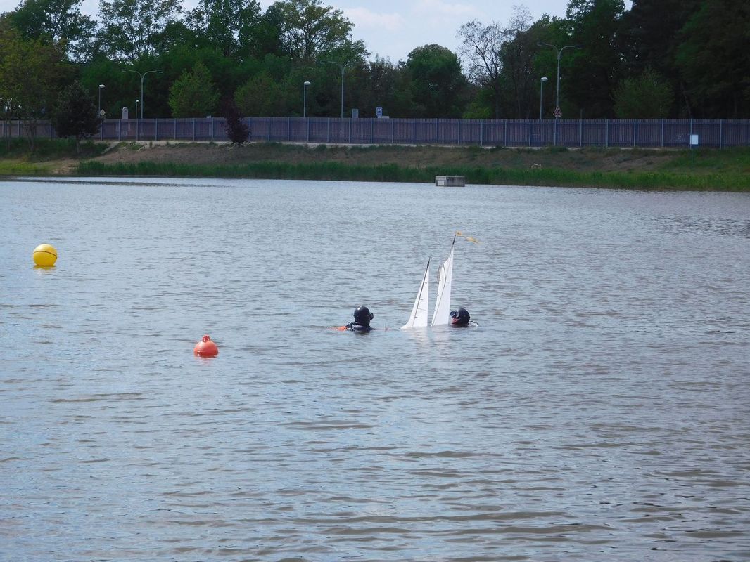 Páteční den byl také dnem, kdy se Vráťovi „zase“ utopila Vamarie. Měli jsme tak bohužel opět možnost vidět práci potápěčů. Je to již potřetí v řadě, když připočtu i podzimní Těrlickou plachtu. Věřím, že to bude na delší dobu poslední takové zpestření našich soutěží. Potápěči jsou kluci šikovní a opět nám zachránili model, který byl nalezen v cca sedmimetrové hloubce. Druhá Vamarie (Wojsiecha Huka) však na vodě vydržela po celý víkend.
