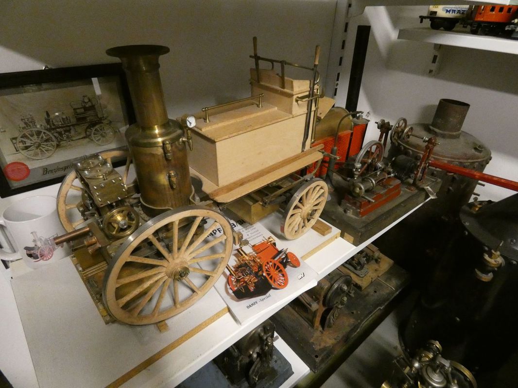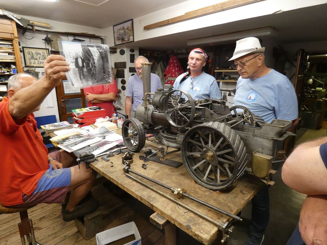 Prohlídka pokračovala v přízemí, či sklepních prostorách rodinného domu, které se postupem času změnily na strojní dílny a výstavní prostory. Nejvíc času jsme strávili v dílně, kde na stole stály funkční modely parních „voraček“. Dvě taková monstra, každé na jednom konci pole, si na laně přetahovaly orací stroj. Po každém přetažení o kus popojely a zorané brázdy rychle přibývaly. Modely vznikají podle dostupných podkladů a budou plně funkční. Proto se také staví dva.