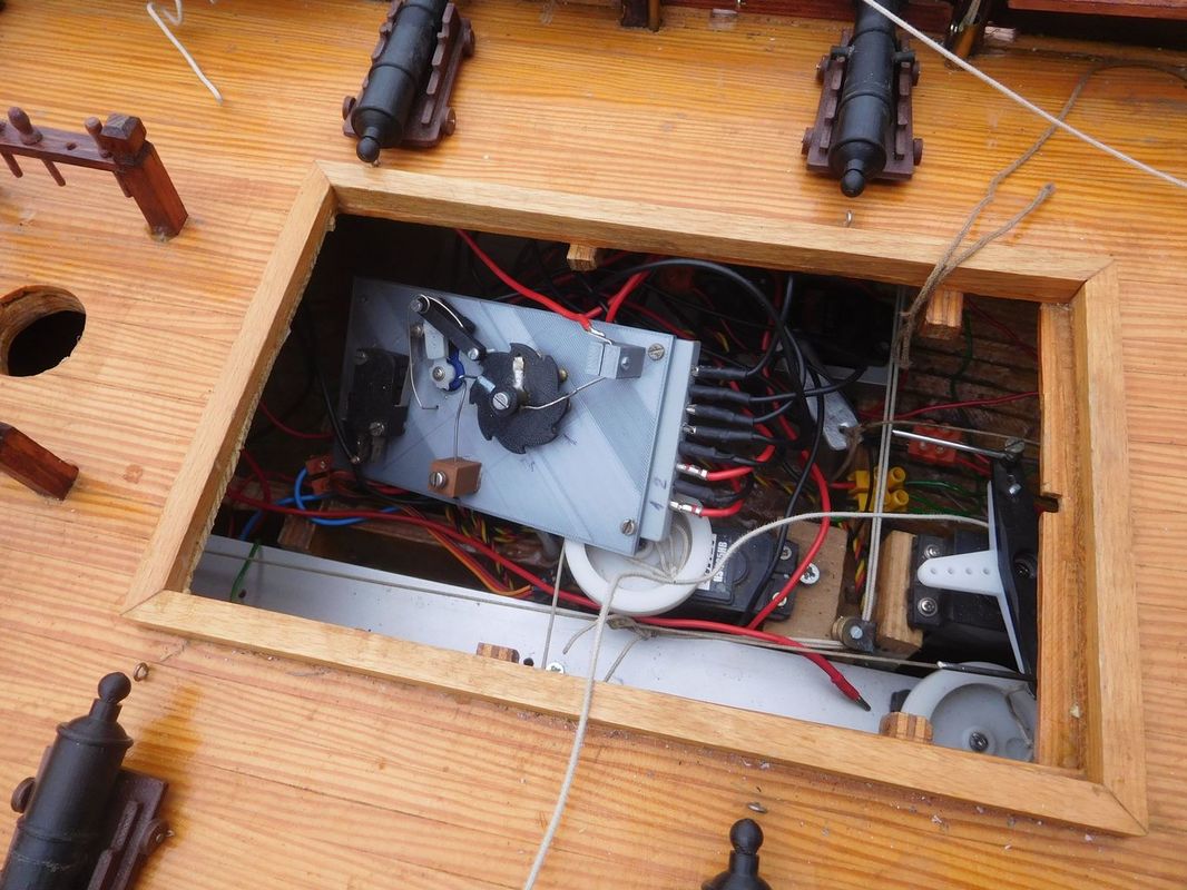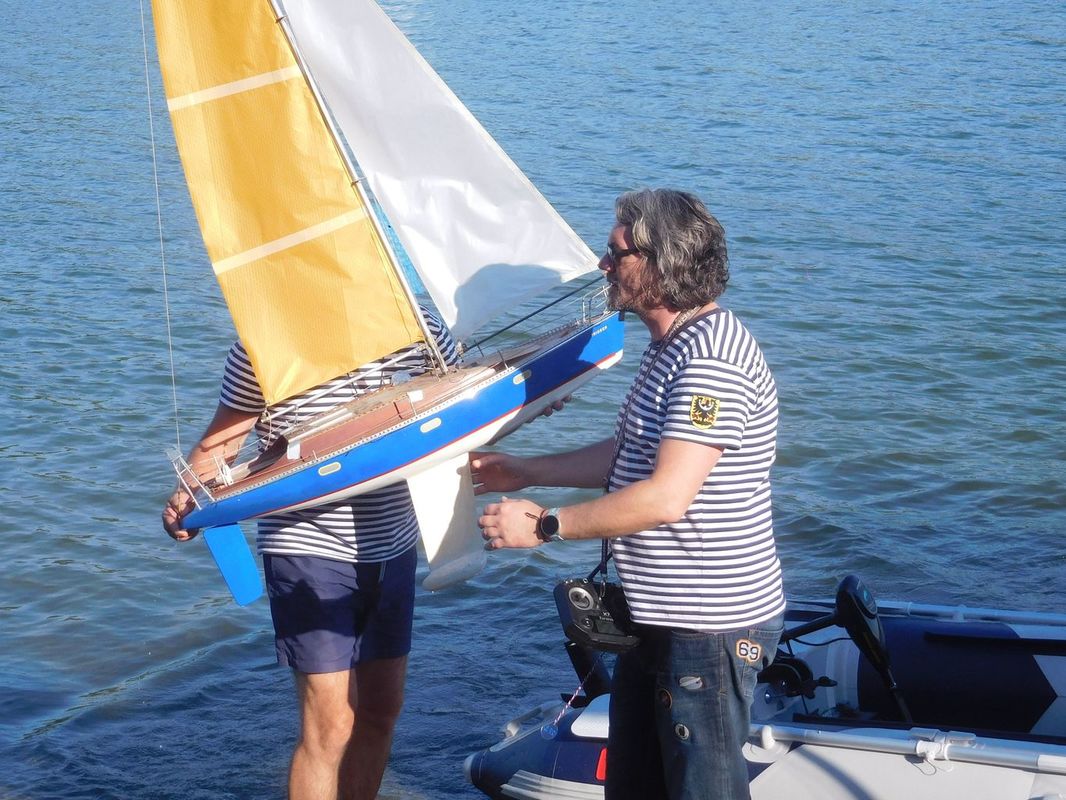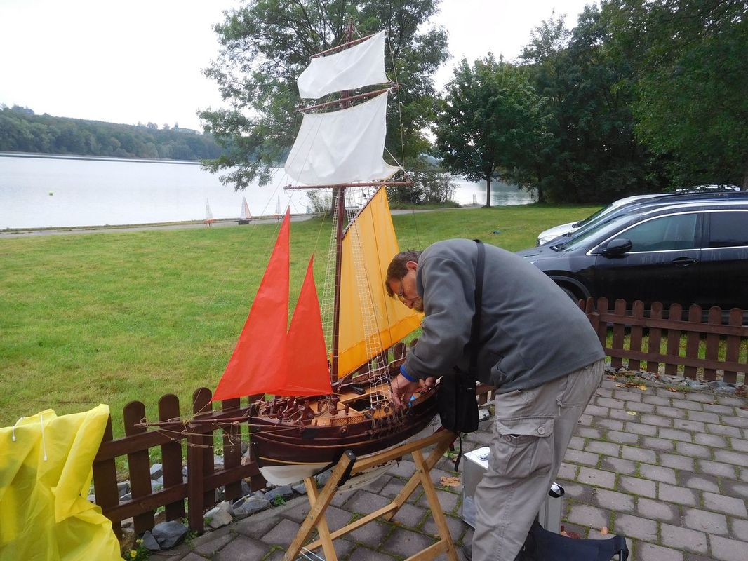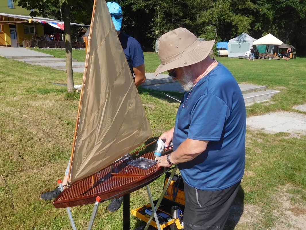 Už v noci přišel déšť, oficiální sobotní závodní část se už nesla v minimálně zatažené obloze a teplotě okolo 14 stupňů. Po zkrácené první jízdě RG 65 byl oficiální nástup a ocenění účastníků pátečních jízd – předání výherních buchet. Po desáté měl pak začít kolotoč jízd NSS a RG 65. NSS za občasného deště a mírného větru začalo. Při dávání na vodu mi přišlo divné, proč mám na palubě u konce čelenu v palubě dírku. Po chvíli mi došlo, že to není jen dírka, ale, že v těch místech stál maketový kotevní vrátek s rohatkovou brzdou a miniaturním typovým štítkem, jo asi klesnul na dno Těrlické přehrady. Zbyl po něm jeden šroubek M1, dva zbývající se přetrhly, hold budu muset maketové upevnění doplnit ještě nějaký pořádným čepem uvnitř vrátku. Jak jsem zjistil z Pepových fotek o vrátek jsem přišel hned v pátek při první rozjížďce.