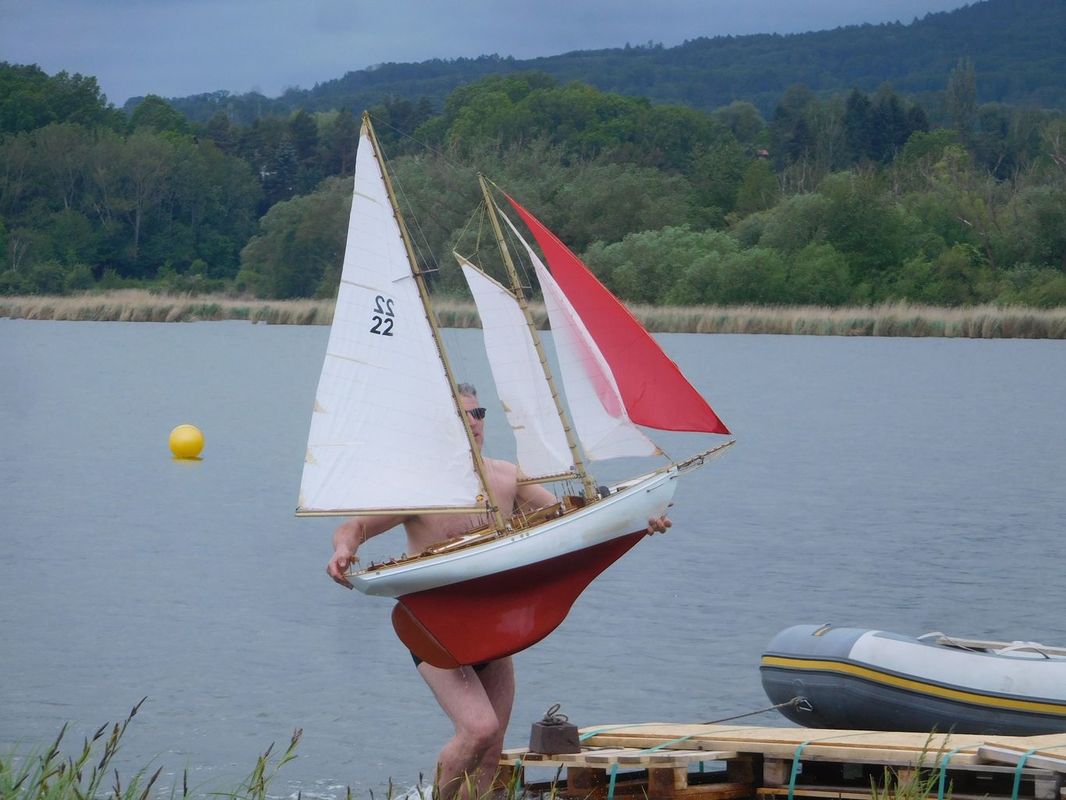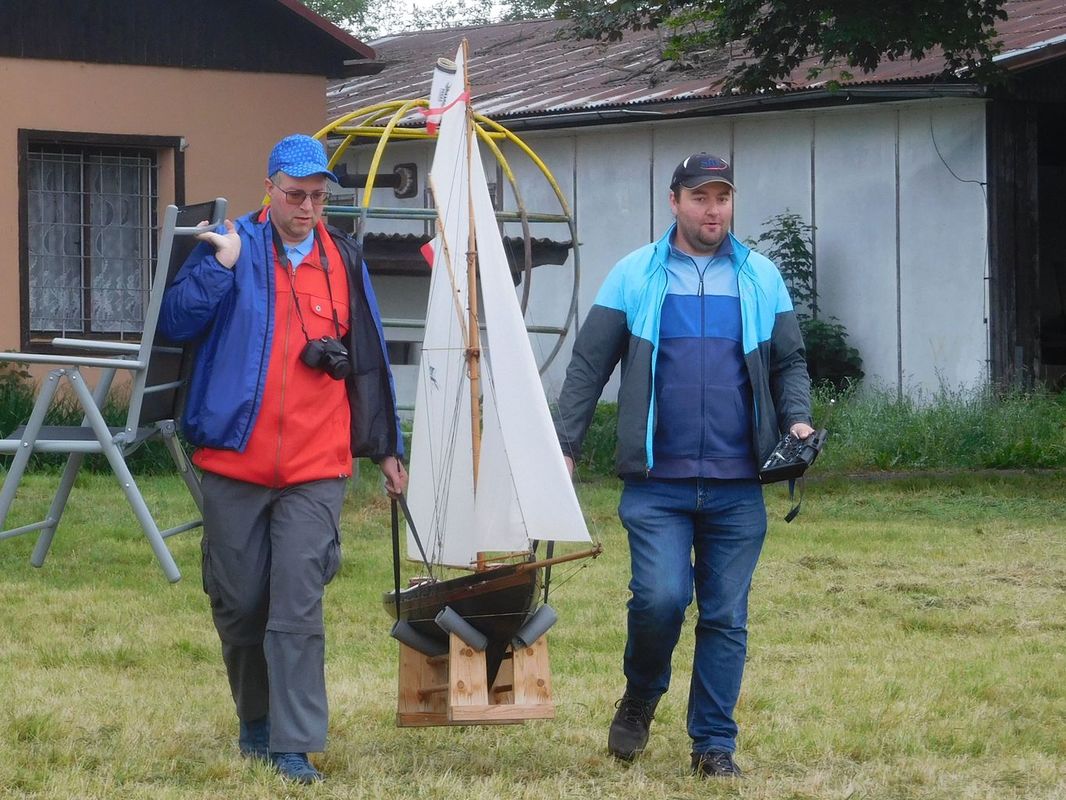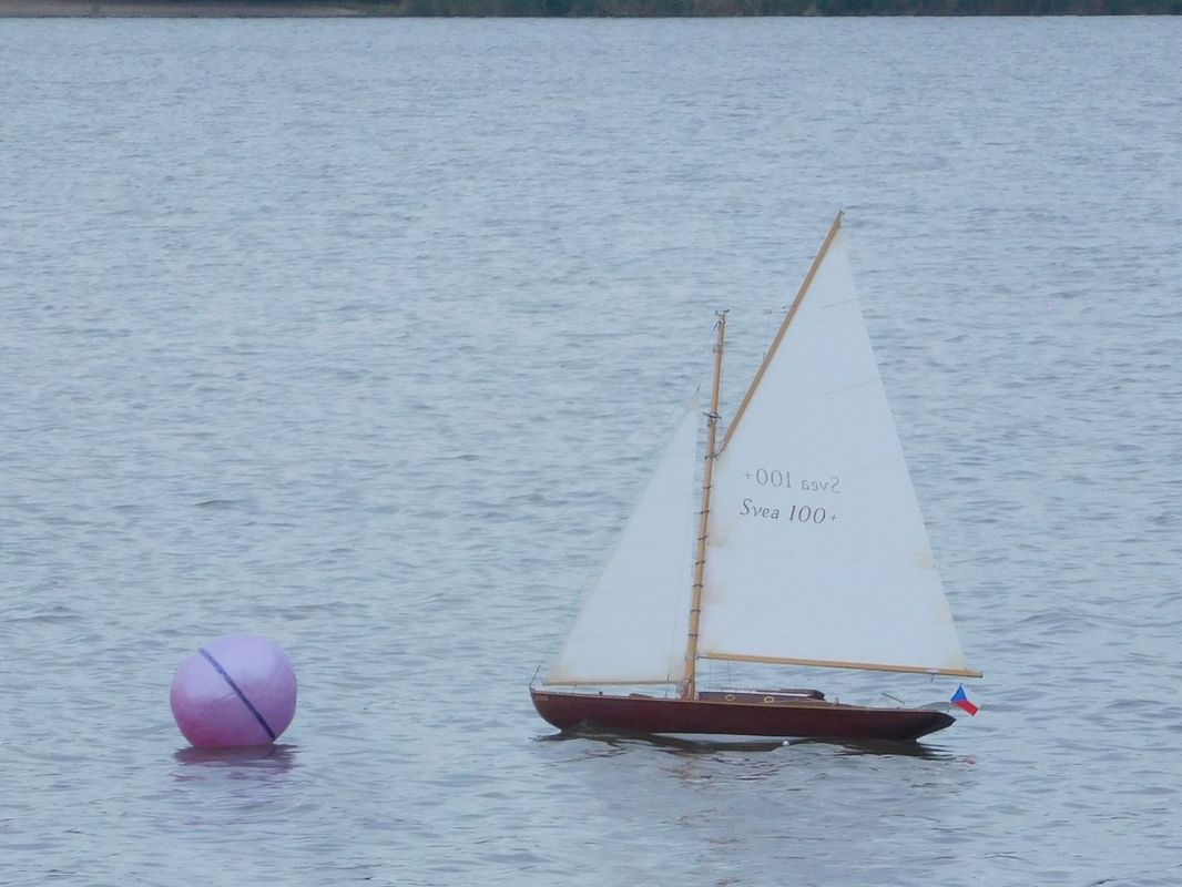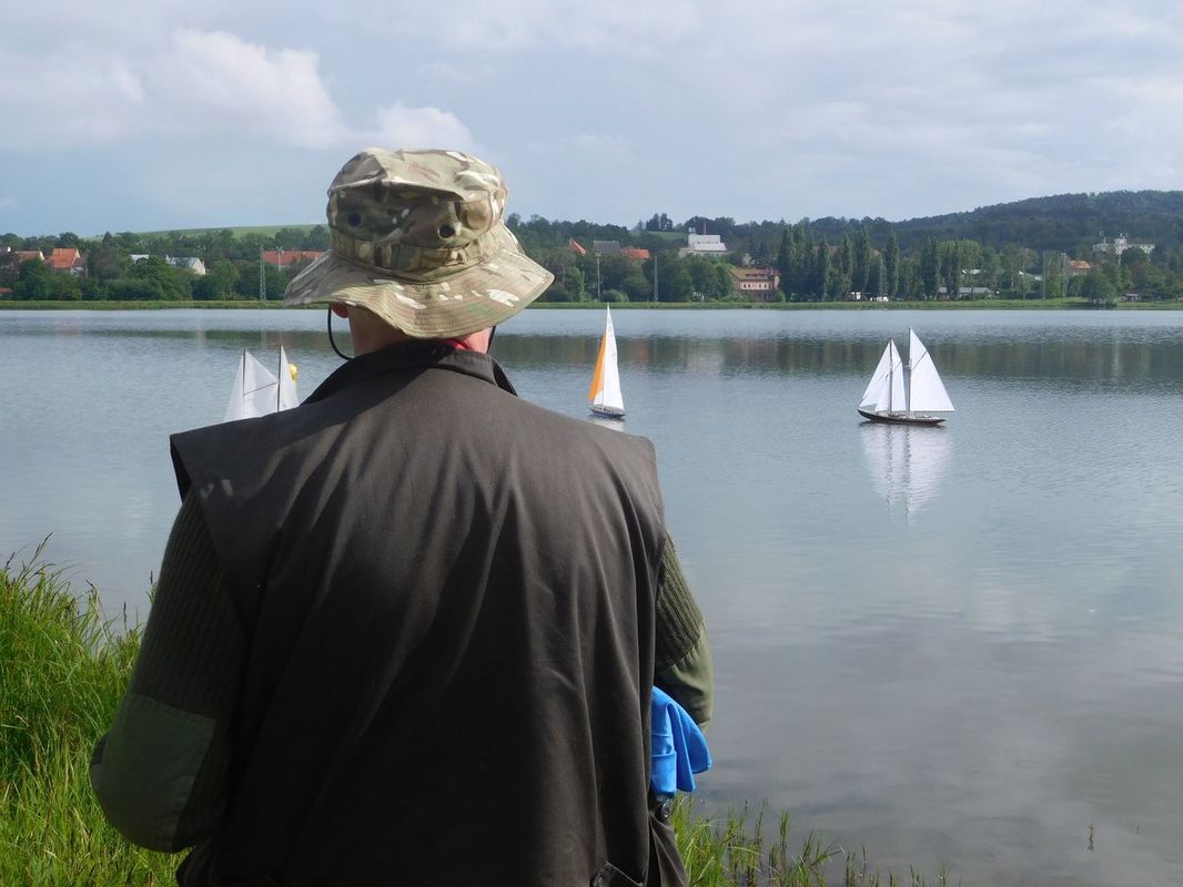 V sobotu ráno jsme se probudili do mírného deště. První na vodě byla kat. D a bohužel celou dobu dost pršelo. Další 2 jízdy byly pro kat. B, takže jsme se vybavili pláštěnkami nebo nepromokavými bundami, mikrotenovými sáčky na rádia a šli jezdit. Vítr se umoudřil a byl mírnější. Můj muž by řekl „vítr příhodný a stálý“. Jezdilo nám to úžasně, takže nějaká troška vody padající z nebe nám až tak nevadila. Skoro bych řekla, že nejvíc si sobotní jízdy užíval Pavel Macháček, protože jeho rybářský škuner byl jednoznačně na špici. Po obědě začalo hustě pršet, a tak se jízdy kat. A o něco posunuly. Déšť sice úplně neustal, ale protože pršelo jen drobně, vydaly se áčka na trať. Bohužel juniorské lodě měly technické problémy, se kterými se kluci snažili vypořádat. Někdy úspěšně, někdy bez kladného výsledku, z čehož byli smutní.