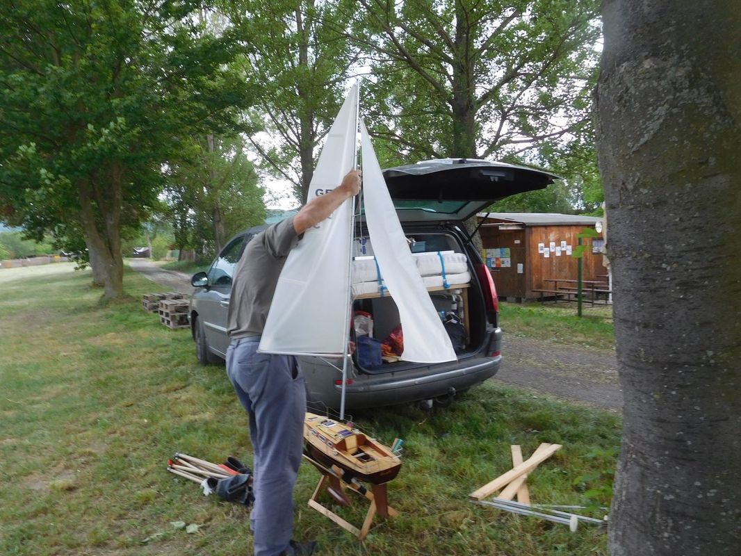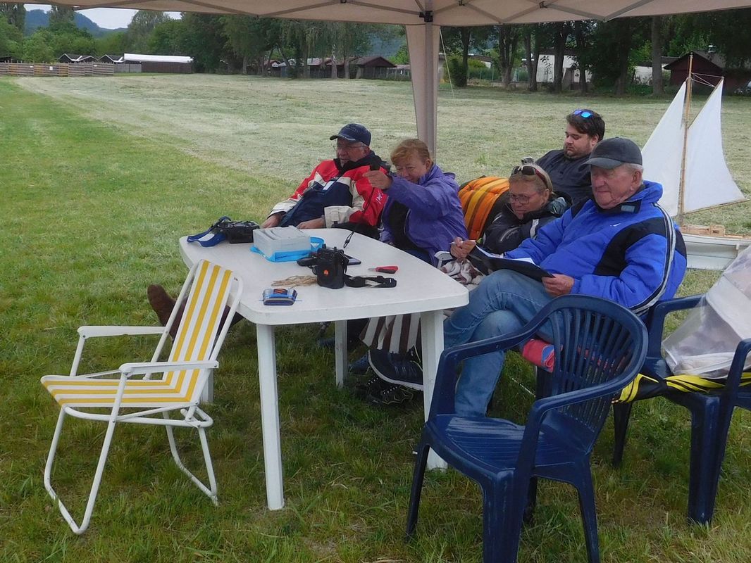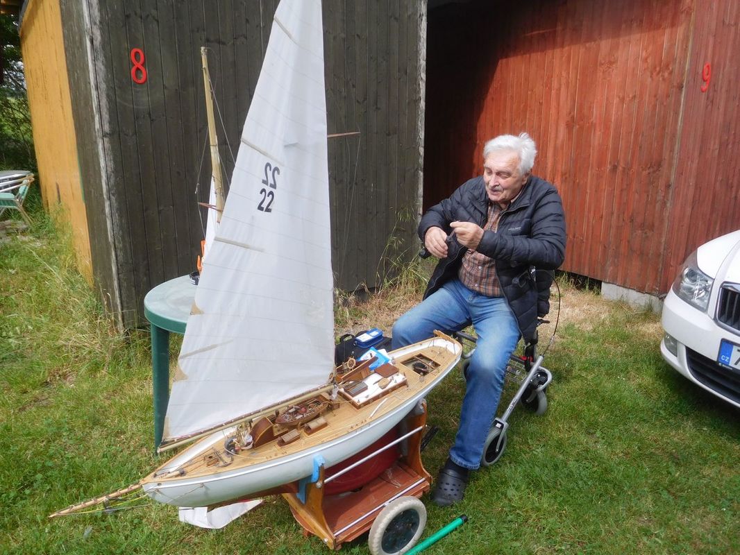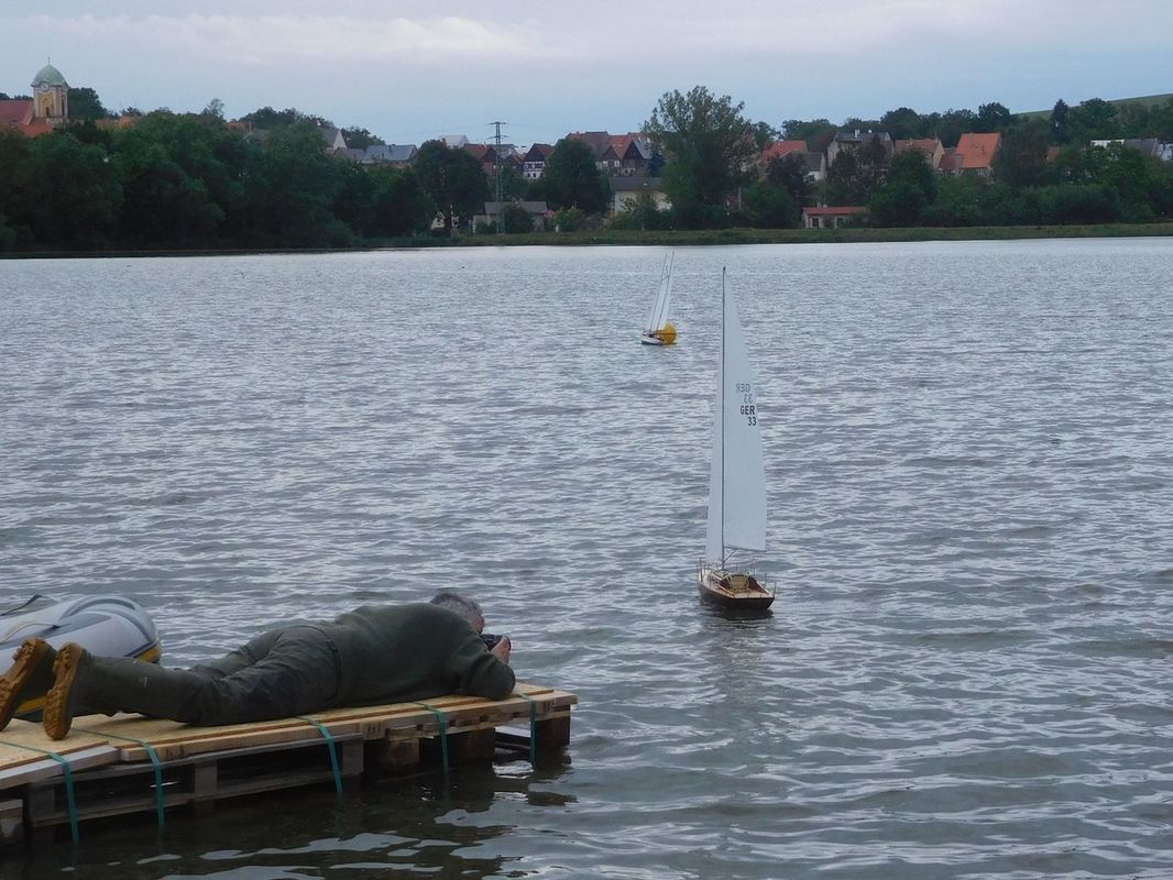 V sobotu ráno jsme se probudili do mírného deště. První na vodě byla kat. D a bohužel celou dobu dost pršelo. Další 2 jízdy byly pro kat. B, takže jsme se vybavili pláštěnkami nebo nepromokavými bundami, mikrotenovými sáčky na rádia a šli jezdit. Vítr se umoudřil a byl mírnější. Můj muž by řekl „vítr příhodný a stálý“. Jezdilo nám to úžasně, takže nějaká troška vody padající z nebe nám až tak nevadila. Skoro bych řekla, že nejvíc si sobotní jízdy užíval Pavel Macháček, protože jeho rybářský škuner byl jednoznačně na špici. Po obědě začalo hustě pršet, a tak se jízdy kat. A o něco posunuly. Déšť sice úplně neustal, ale protože pršelo jen drobně, vydaly se áčka na trať. Bohužel juniorské lodě měly technické problémy, se kterými se kluci snažili vypořádat. Někdy úspěšně, někdy bez kladného výsledku, z čehož byli smutní.