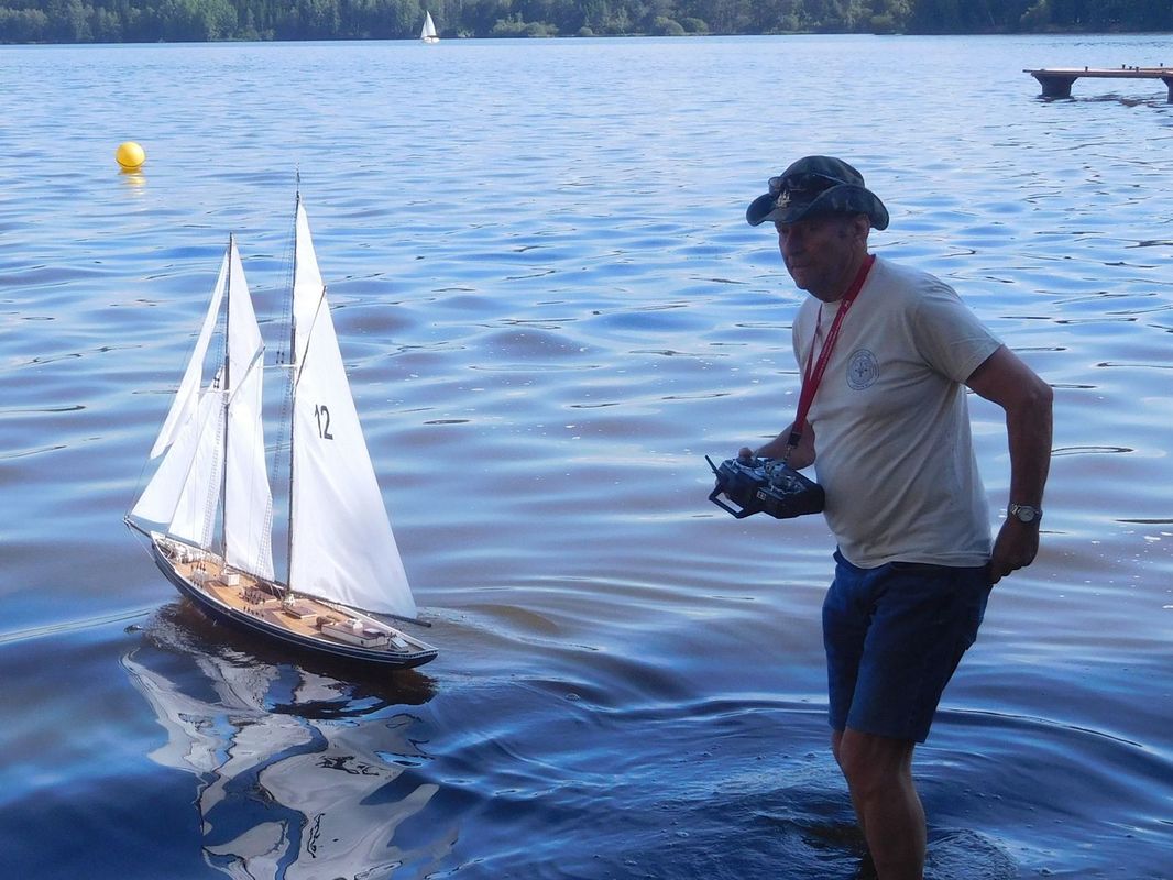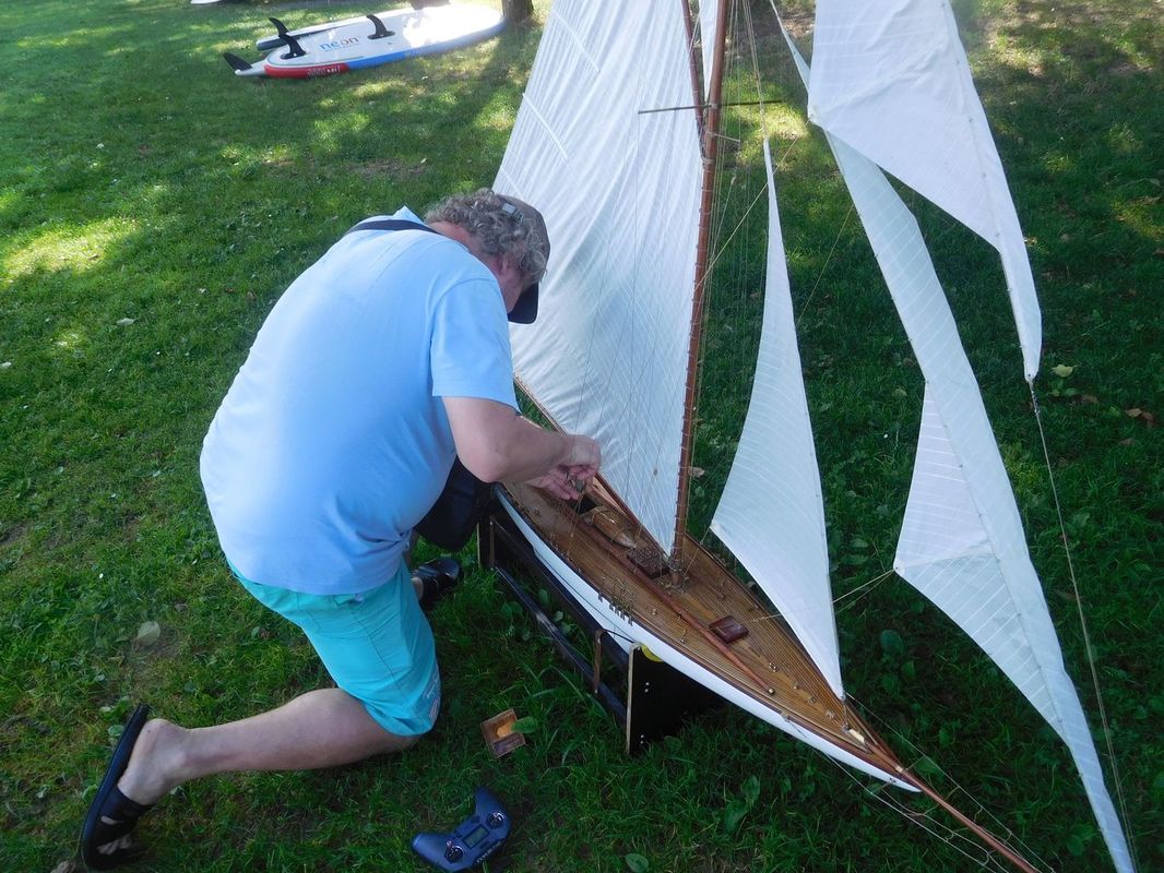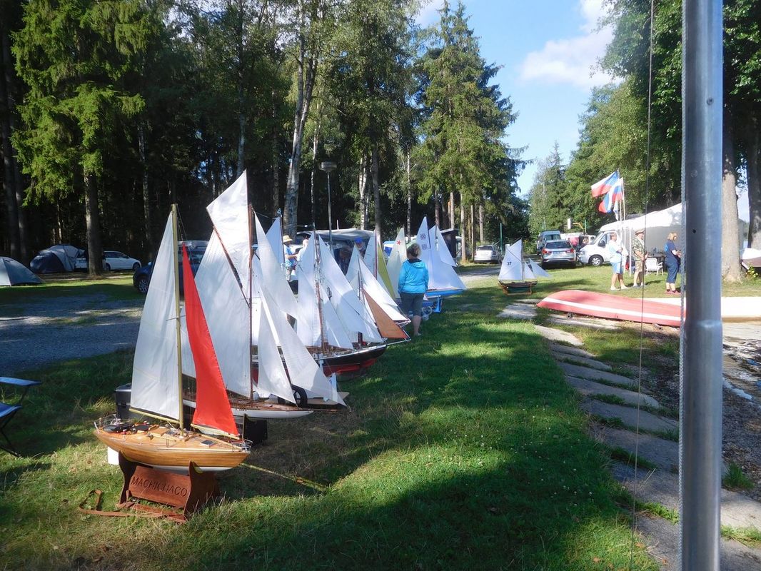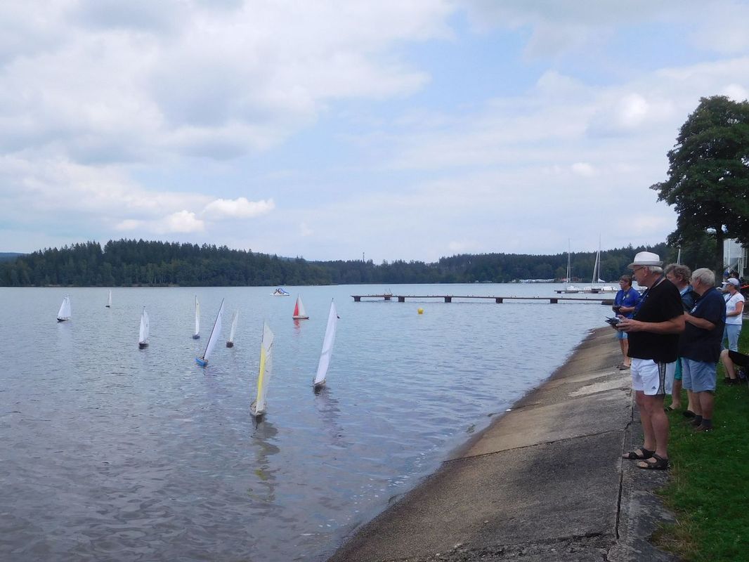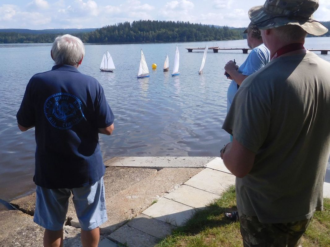 Následující ráno bylo ještě krásnější, než to páteční. Před první jízdou dorazili Jakešovi a Péťa Kotlárová, takže startovalo 14 lodí. Víc jich už na vodě nikdy nebylo, naopak nám soutěžící ubývali kvůli technickým závadám svých modelů. Po dopolední jízdě Pepa vyhlásil plavbu do hospody na hráz, které se účastnila většina lodí a také jako doprovod s námi šli Jakubíci, kteří se na nás přijeli podívat a strávili s námi na Dářku skoro celou sobotu. Při cestě zpět měl technickou František Chmelka – utrhla se mu kosatka, ale dojel do cíle, a Péťa Kotlárová svou loď musela svézt člunem. Kompletní sestava kapitánů a jejich lodí je na fotografii: