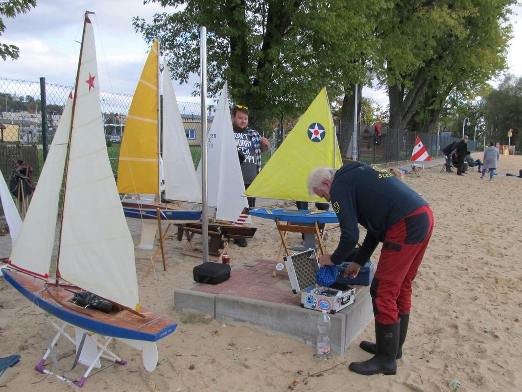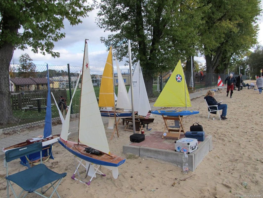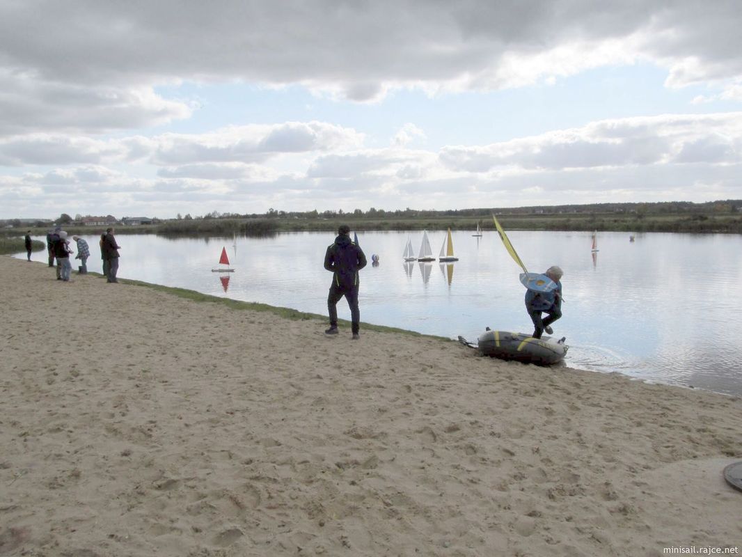 Jednotlivé rozjížďky byly zkráceny na 30 minut – Michal Daranowski využil mé připomínky ke zvažované třídě NSS-junior, kde jsem navrhl zkrácení z 60 na 30 minut, aby junioři vydrželi v pozornosti po celou dobu závodu a trochu více je to bavilo. I tady při závodech se to osvědčilo. Jely se vždy dvě jízdy po sobě. Za 30 minut, respektive po 6 až 8 kolech, které vycházely výpočtem na 30 minut, nedošlo k velkému roztažení pole, takže se moc dlouho nečekalo na posledního a hned navazoval další start. V sobotu jsme tedy stihli jak v NSS-open, tak NSS-650 2x po dvou jízdách. Vítr byl po celý den skoro rovnoměrný o síle 1-3 m/s. Po celý den jsme mohli na druhém břehu, na letišti, sledovat starty parašutistů, jednotlivců, ale hlavně asi komerční tandemy, kteří byli taháni dvěma navijáky do výšky asi 400 m. Občas se mezi ně ještě přidal někdo s motorovým rogalem nacvičující starty a přistání, nebo i motorovým paraglidem. Večer byl zde tradiční, několikahodinové vaření žurku (polévky) a guláše v kotlíku nad ohněm. Polský Minisail využívá toto podzimní setkání na výroční členskou schůzi klubu (polský Minisail má oficiální status registrovaného spolku a působí tak paralelně k hlavnímu modelářskému spolku LOK, kde je i sekce NS s částí NSS). Probrali stav fungování, výhled na závody v příštím roce, koordinované hlavně s českým klubem ze Slezska, pro jehož členy jsou polské závody blíže než většina českých a poslední dobou na závodech polského Minisailu i dominují jak účastí, tak výsledky nad polskými účastníky. Částečně byl diskutovaný i s námi neutěšený stav v sekci Naviga NS.