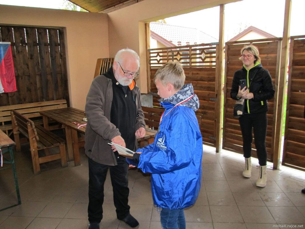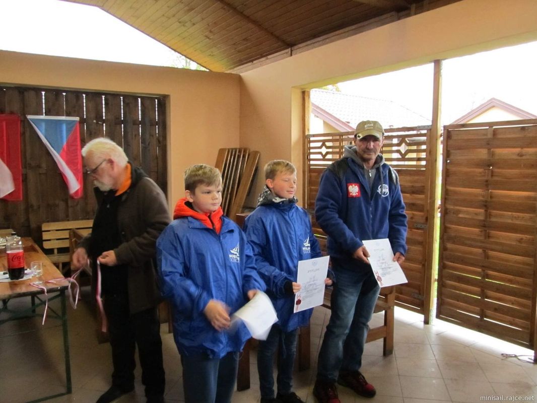 Po dobu čekání, kdy všichni už měli všechno uklizené, jsme se dříve než starosty dočkali deště, ve dvě hodiny tedy nastalo vyhlášení pod přístřeškem. Hlavní kategorii NSS-open a Pohár starosty získal Tomáš Jakeš s Amati, druhý byl René Walenta s Barakudou a třetí já s Lonou. Poměrně rozměrný a těžký putovní pohár – kvádr z pinczowského vápence s plaketou tedy putoval zpět do Doks. Pokud to půjde takhle dál, bude to vápenec s nejvíce nacestovanými kilometry, už teď jich má 1900 a jistotu dalších 630 km. No alespoň bude mít Tomáš něco pod stromečkem. V ostatních seniorských kategoriích NSS-650 a Sunfish si první místa rozdělili bratři Lembasové, Janusz NSS-650, Zbyszek Sunfish. V NSS-650 Standard Junior zvítězil Rafał Bruchmüller. V rychlé trochu divočejší nedělní regatě vyhrál Tomáš Jakeš. Po vyhlášení výsledků nakonec Tomáš zamkl vodu pro NSS plachetnice.