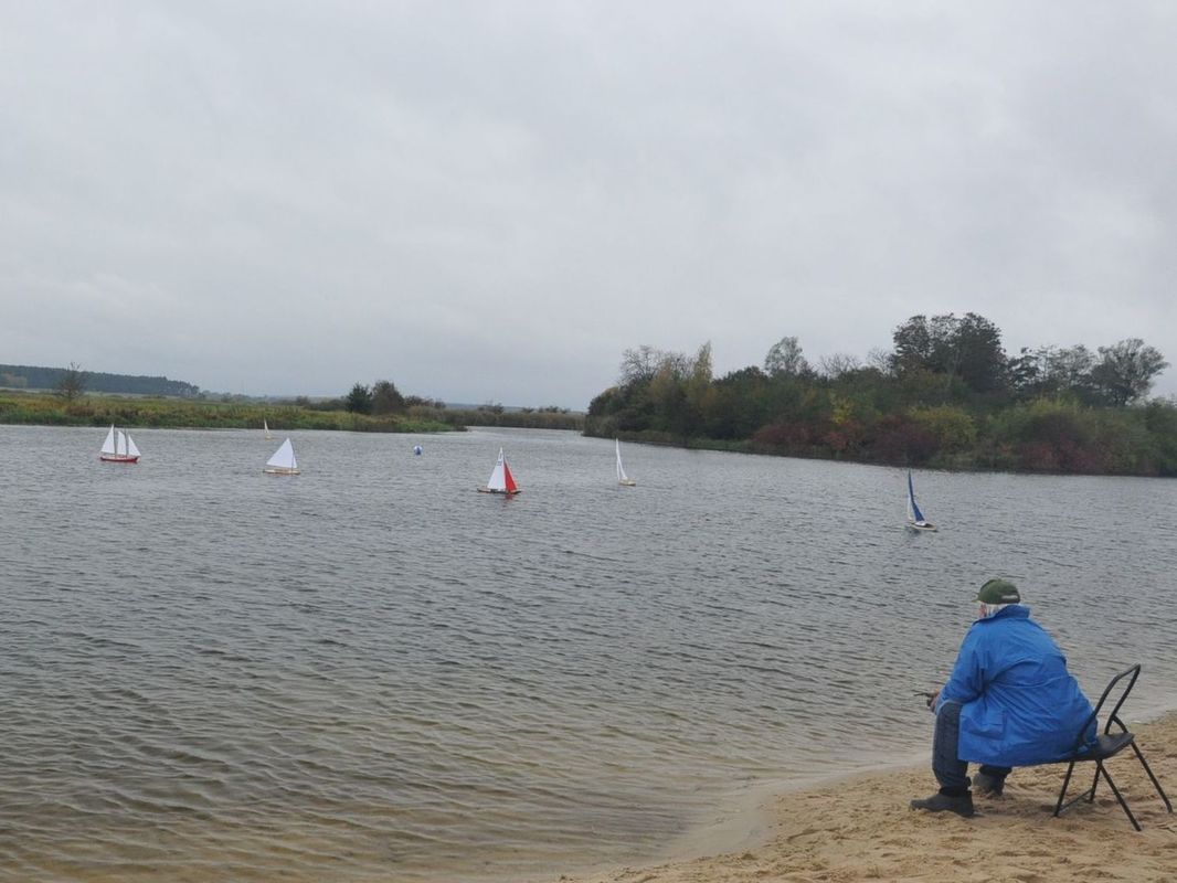 V neděli po ránu opět drobně mžilo, do devíti hodin byl vítr asi do 3 m/s. Start třetí rozjížďky byl plánován na desátou, to už vítr opět zesílil, byť na méně než v sobotu. Já jsem před devátou zjistil, že mi jeden naviják změnil asi o dvě otočky středovou polohu a druhý v nějaké obecné pozici funguje na obě strany, ale když dojede na konec, už nejede zpět. Takže u obou pravděpodobně zaplavené potenciometrické dráhy. Servo hlavní plachty a kormidla vypadalo v pořádku. Měl jsem sebou dva navijáky, jeden jsem dal Petře druhý by mi nestačil, a stejně se mi do výměny moc nechtělo. Takže jsem plachetnici rozebral a šel se koukat na jízdu.