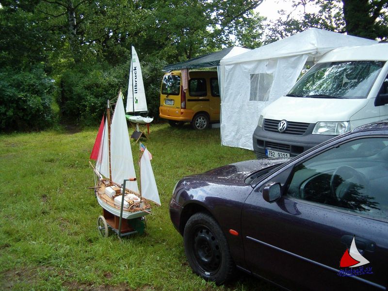 Tentokrát se hovor stáčel na téma co vlastně máme společného s „F-kaři“. Opět se totiž ukázalo, že plachty jsou jaksi navíc. Jako místo pro naši soutěž byl vybrán protější břeh rybníka, kde se muselo dojet z kempu autem, na kterém však nebylo místo na parkování. O uložení sestavených modelů ani nemluvě. Pořadatel to myslel dobře, břeh v těch místech nebyl lemován staletými duby jako jinde a vítr by tam byl možná lepší, ale technicky to bylo nerealizovatelné. Závěry večerních rozprav byly dva. Jediné, co nás spojuje s „F-kaři“ je Zdeněk. Jinak my potřebujeme vítr, oni bezvětří, nám vlny nevadí, zatímco pro „F-ka“ jsou pohromou. Druhý závěr byl ten, že musíme najít místo pro naše jízdy na straně kempu.