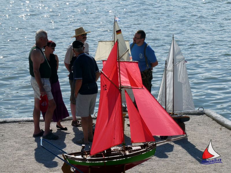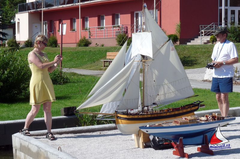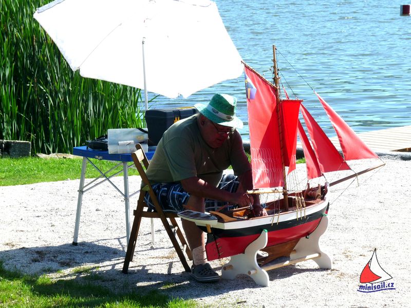 Aj po príchode všetkých slovenských pretekárov boli českí pretekári v prevahe. Nezvrátil to ani príchod Peťa Mikulku , ktorý aj keď bez lode ktorú nestihol opraviť, prišiel aspoň povzbudiť a posedieť s kamarátmi. Skôr ako som stačil vybaliť a ubytovať sa, musel som poskladať loď a jazdiť. Fúkal veľmi svieži vietor, niekedy až tak veľmi, že to niektoré modely nemali jednoduché. Boli preto potrebné aj záchranné akcie v podobe veslovania za modelom, alebo vyslobodzovanie modelu z rákosia pri brehu. Hladinu adrenalínu občas zvyšoval aj výkon rozhodcov, ktorí pravdepodobne preto, že väčšinu súťažiacich nepoznali (alebo z dôvodu slabšieho sluchu – cha cha cha) otravovali pretekárov otázkami typu „kto to prešiel cieľom“ alebo „kto sa to hlásil pred ním“ za čo boli samozrejme odmenení pochvalami od pretekárov. Nakoniec však všetko dobre dopadlo k spokojnosti ( dúfam ) že všetkých.