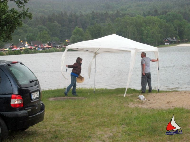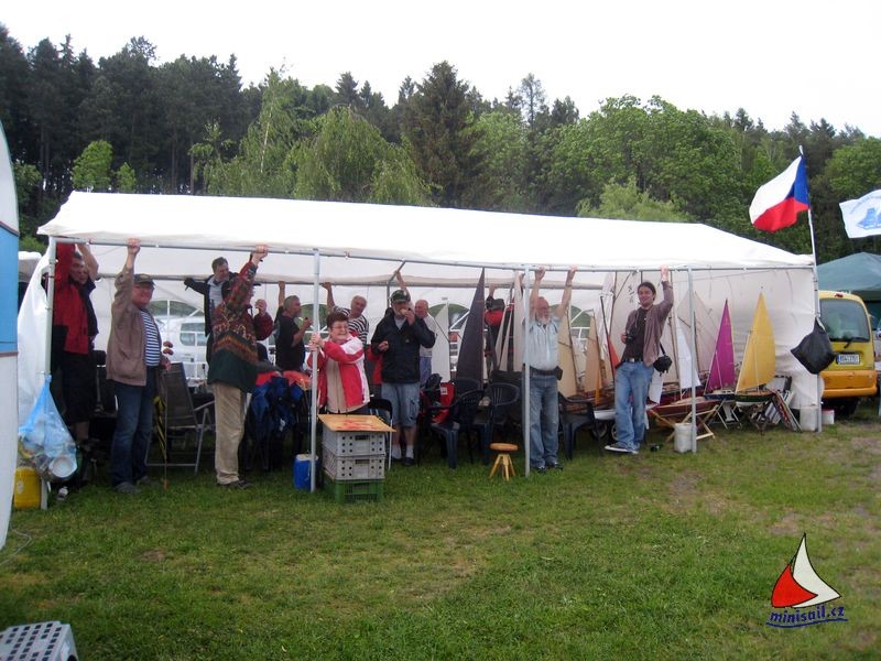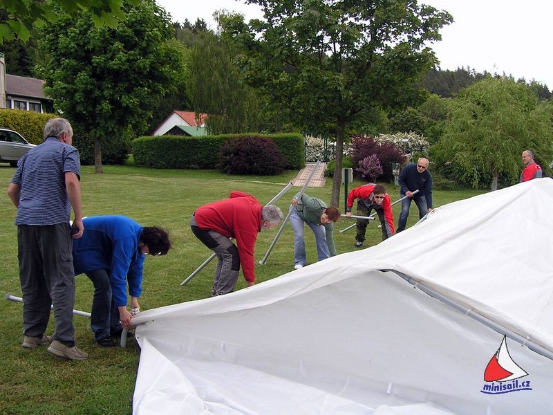 Jelikož mám momentálně více volného času, byla jsem požádána o napsání pár řádků o první a druhé soutěži plachetnic NSS v rámci seriálu Mistrovství ČR, která se konala v Jinolicích, v osvědčeném kempu Eden. Jako vždy se první nadšenci a také pořadatelé z Jablonce začali sjíždět už během čtvrtečního dopoledne. Začala stavba party stanů a zázemí pro rozhodčí. Sehranému týmu pořadatelů a jejich pomocníků šla práce od ruky a v době našeho příjezdu (mne s Michalem), před polednem, bylo téměř vše hotovo. Nechybělo tradiční přivítání každého nově příchozího s rumem NA VÍTR od Miloše Jakubíka. Jen Ladouse se stále nikomu nepodařilo k tomuto přípitku přesvědčit.